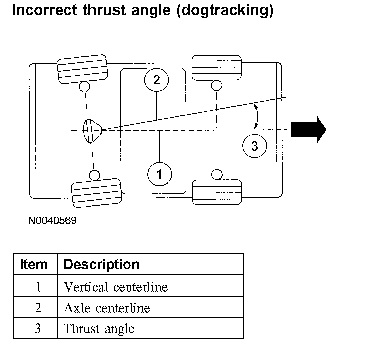 Incorrect thrust angle (dogtracking) is the condition in which the rear axle is not square to the chassis. Heavily crowned roads can give the illusion of dogtracking.