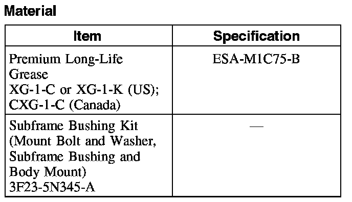 NOTE: The subframe bushing, body mount, bolt and washer are installed as a kit. Apply general purpose grease to the subframe bushing and press in to the subframe.