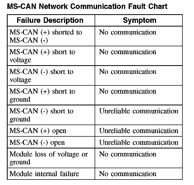 The fault chart describes the specific MS-CAN network failures and their resulting symptom.