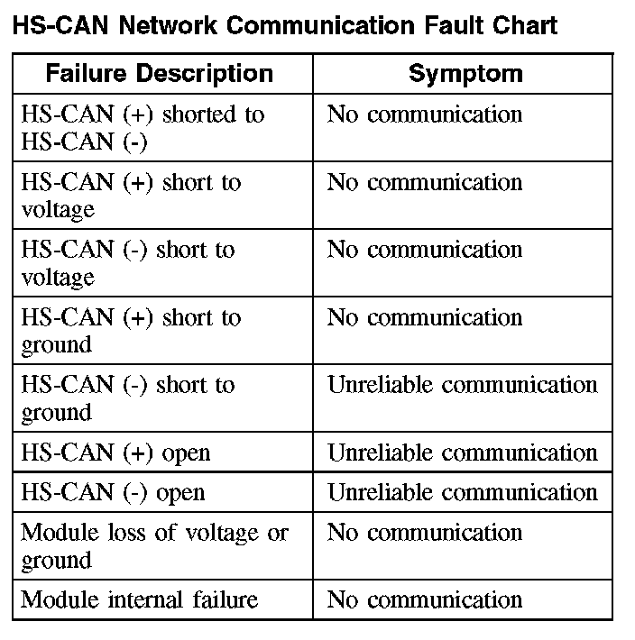 The fault chart describes the specific HS-CAN network failures and their resulting symptom.