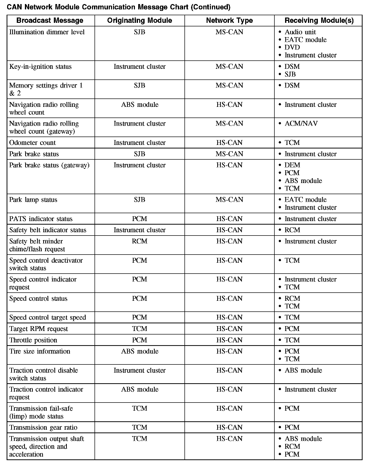 The HS-CAN network uses an unshielded twisted pair cable of data (+) and data (-) circuits. The data (+) and the data (-) circuits are each regulated to approximately 2.5 volts during neutral or rested network traffic. As bus messages are sent on the data (+) circuit, voltage is increased by approximately 1.0 volt. Inversely, the data (-) circuit is reduced by approximately 1.0 volt when a bus message is sent. Multiple bus messages can be sent over the network CAN circuits allowing multiple modules to communicate with each other. The HS-CAN is a high speed communication network used for the instrument cluster, the powertrain control module (PCM), the transmission control module (TCM), the differential electronic module (DEM), the restraints control module (RCM), and the anti-lock brake system (ABS) module communications, and designed for real time information transfer and control. The HS-CAN network will not communicate while certain faults are present, but will operate with diminished performance with other faults present. The HS-CAN bus may remain operational when 1 of the 2 termination resistors are not present.