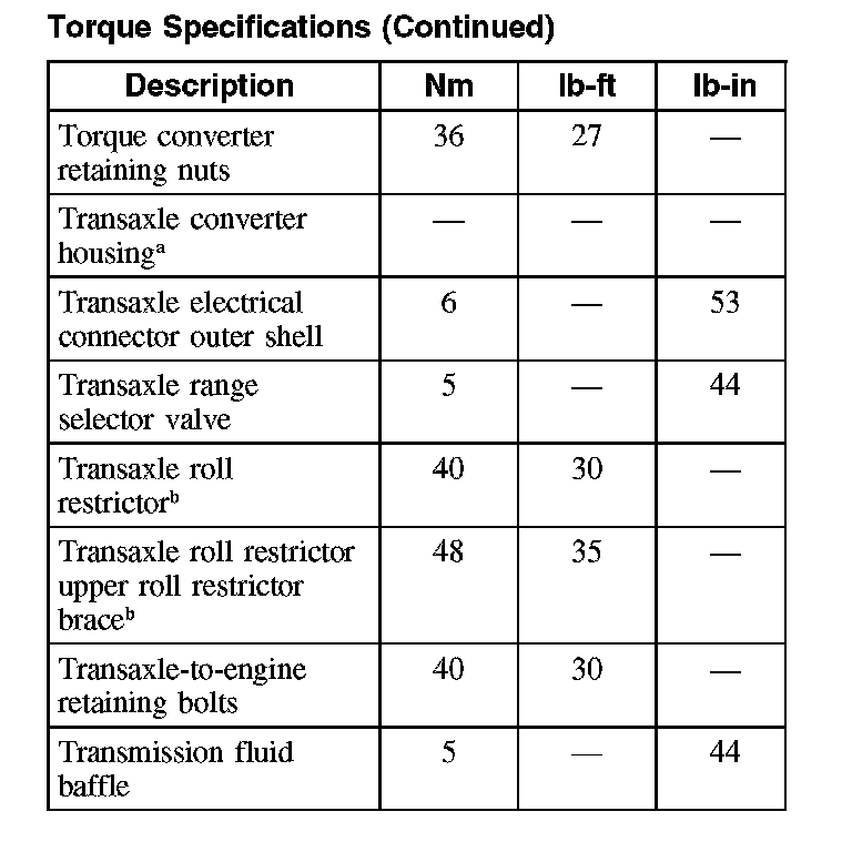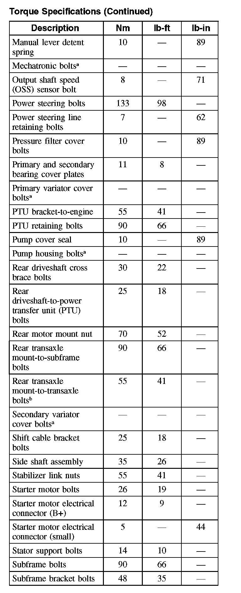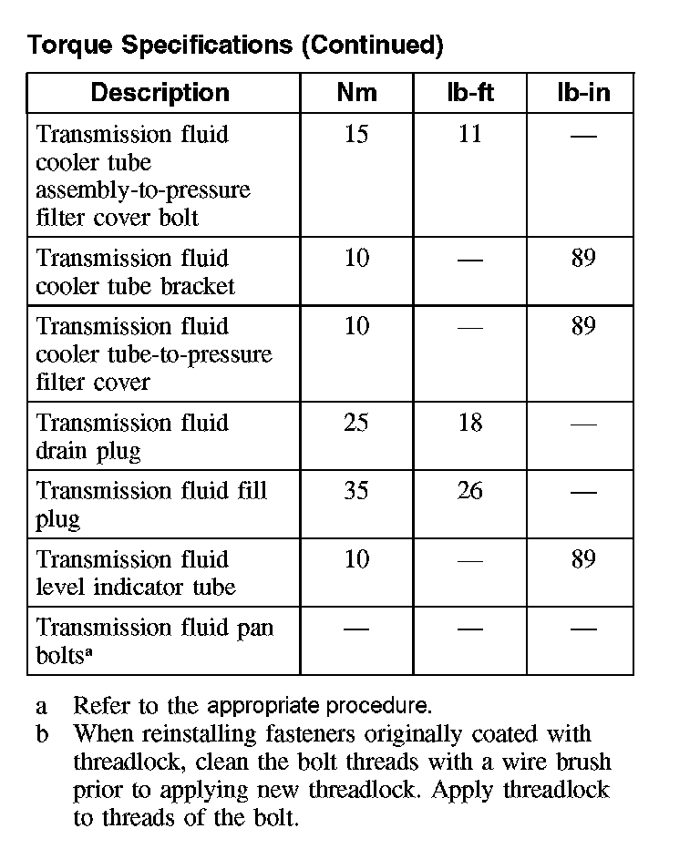 Fluid pan bolts 12 Nm (9 ft. lbs.)