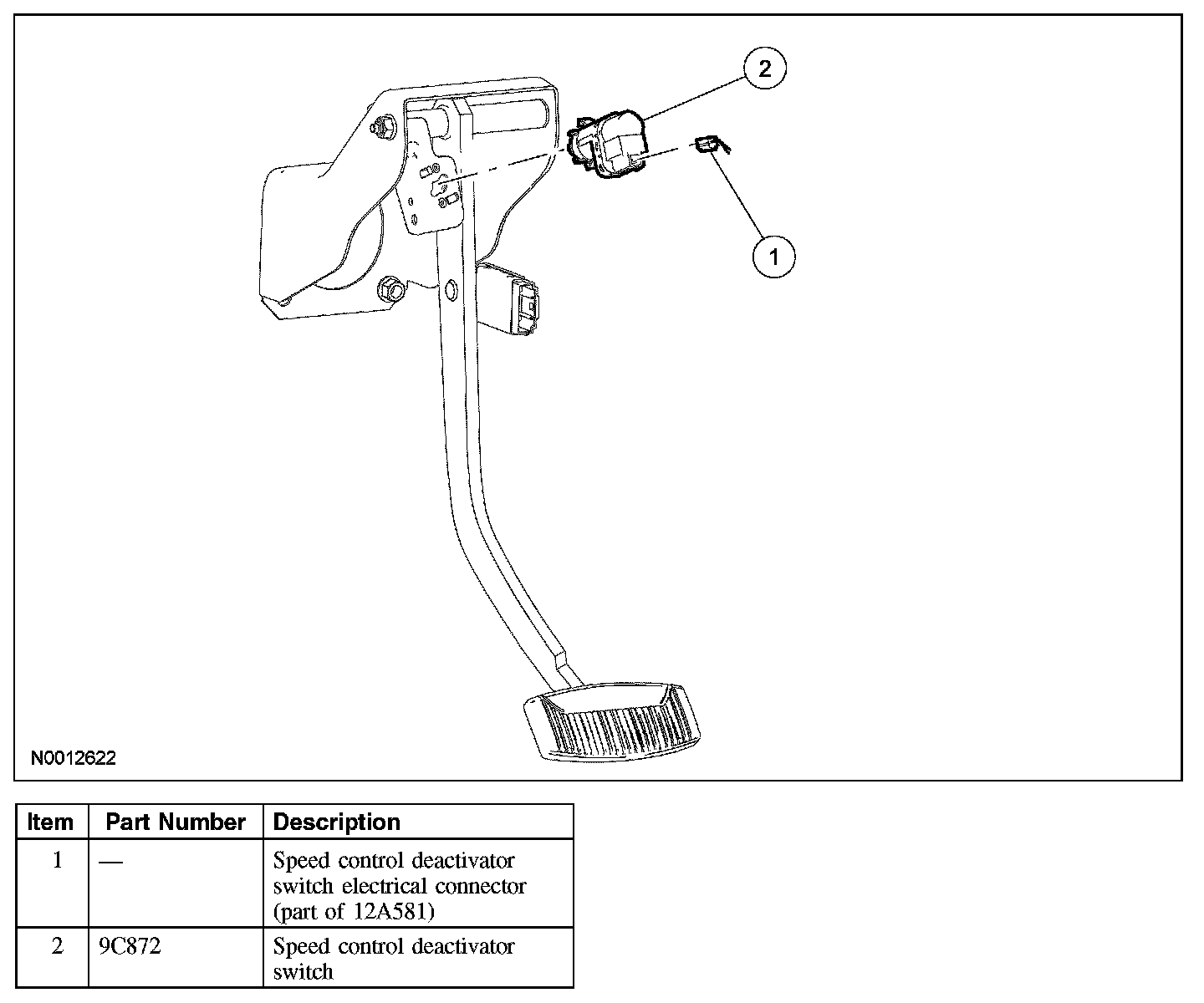 1. CAUTION: Do not press the brake pedal when removing or installing the speed control deactivator switch or damage to the switch will occur.