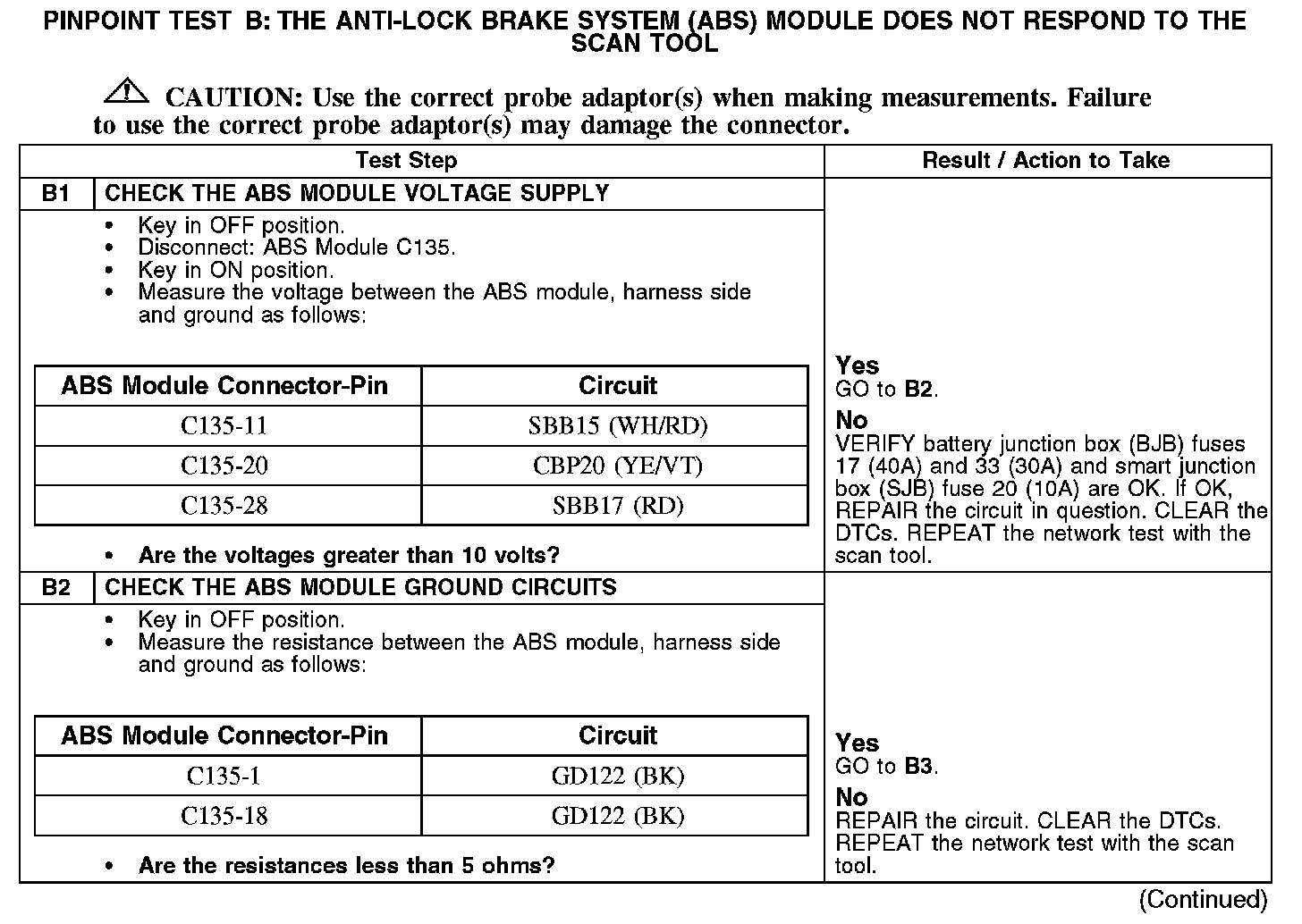 PINPOINT TEST B: THE ANTI-LOCK BRAKE SYSTEM (ABS) MODULE DOES NOT RESPOND TO THE SCAN TOOLB1-B2: