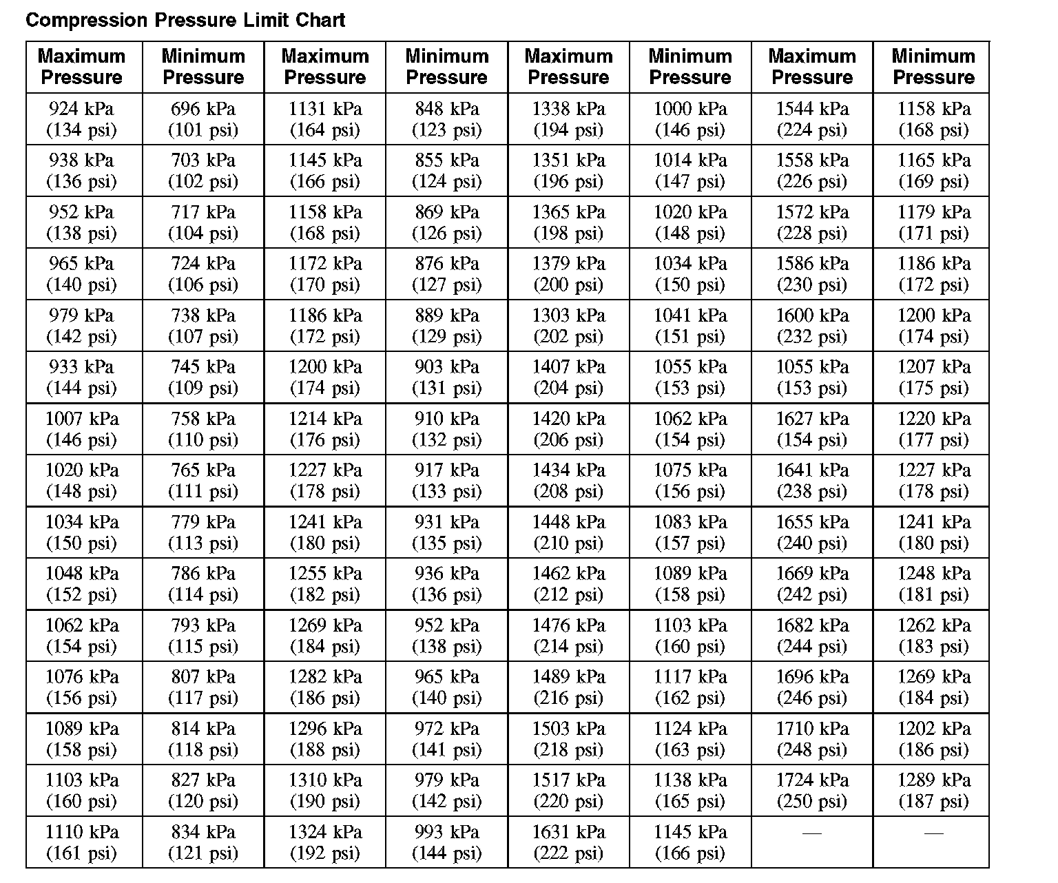The indicated compression pressures are considered within specification if the lowest reading cylinder is at least 75 percent of the highest reading. Refer to the Compression Pressure Limit Chart.