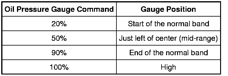 - Select the IPC oil pressure gauge (OIL_PRESS) active command and scroll the gauge according to the following table: