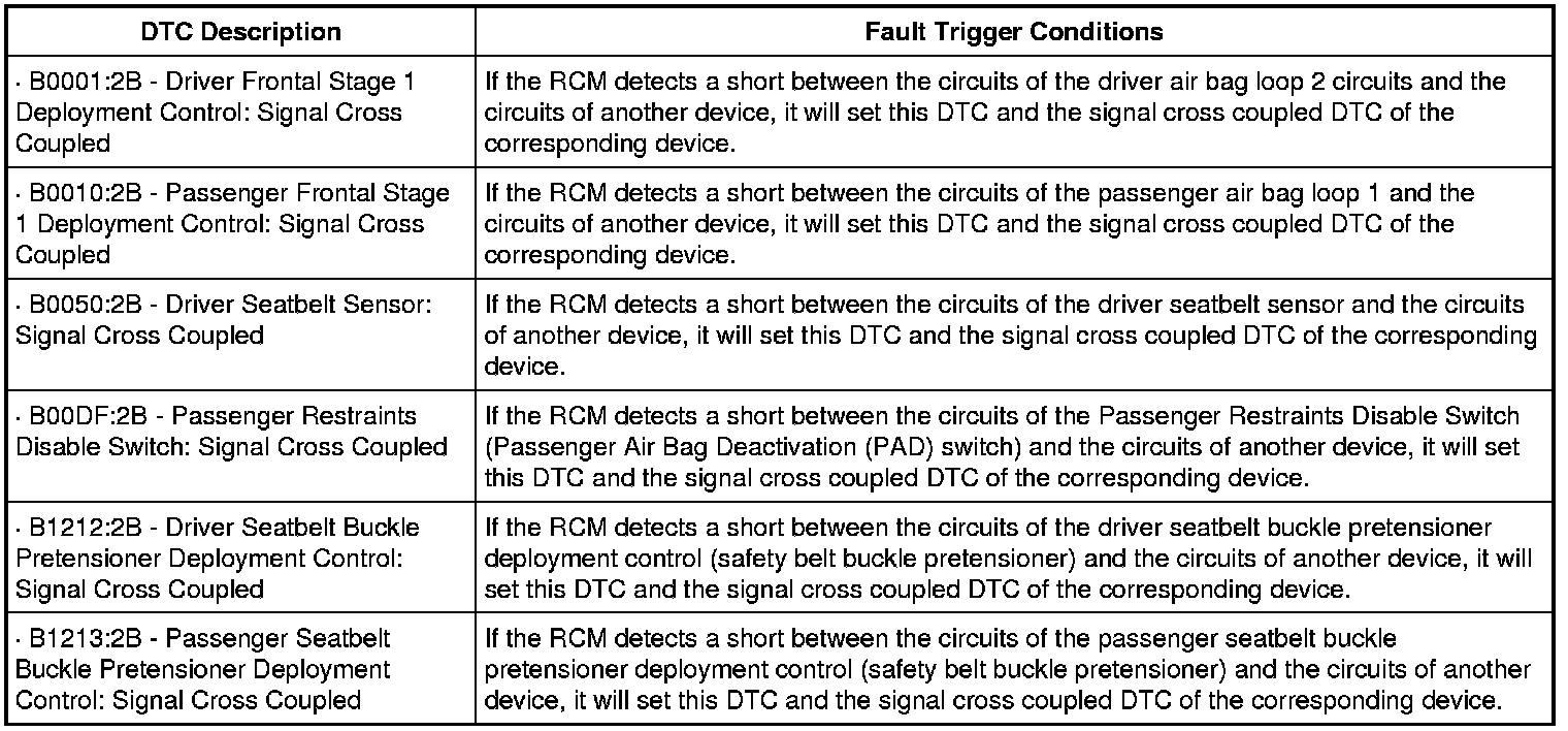 The Restraints Control Module (RCM) monitors driver air bag, passenger air bag, Passenger Air Bag Deactivation (PAD) switch, driver safety buckle switch and safety belt pretensioner circuits for a signal cross coupled (short) between circuits. If the RCM detects a short between the circuits of one device and another device, it will store a DTC for each of the signal cross coupled faults in memory. The RCM sends a message to the Instrument Cluster (IC) module to illuminate the air bag warning indicator. When a normal loop fault is present (one loop is either shorted to battery/ground, has an open circuit or has low resistance), then signal cross coupled diagnostics will not be active. Once the normal loop fault is repaired, then the signal cross coupled diagnostics will resume.