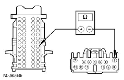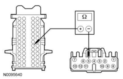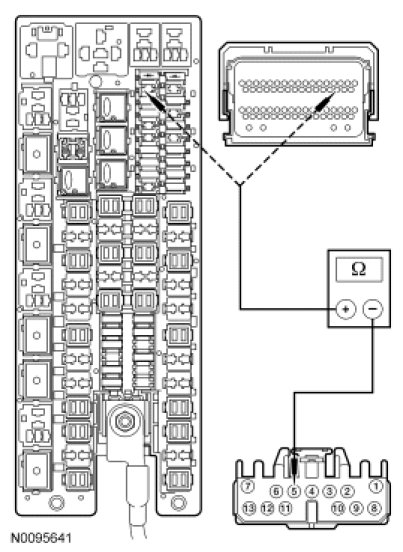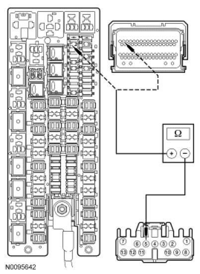 - For diesel engine vehicles only, measure the resistance between ignition switch C250-5, circuit CDC35 (BU/WH), harness side and SJB C2280B-32, circuit CE336 (GN/WH), harness side.