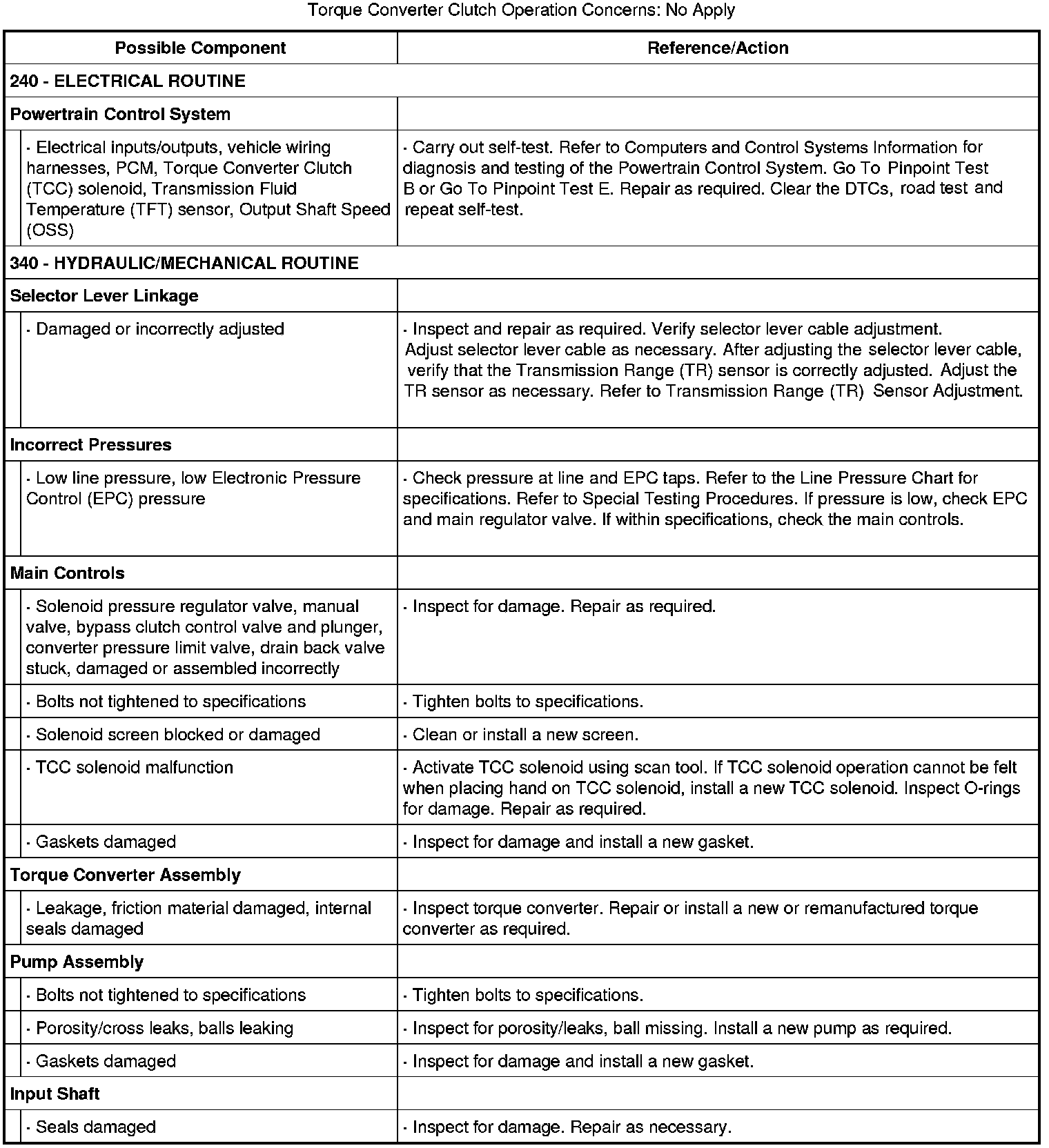 Torque Converter Clutch Operation Concerns: No Apply: