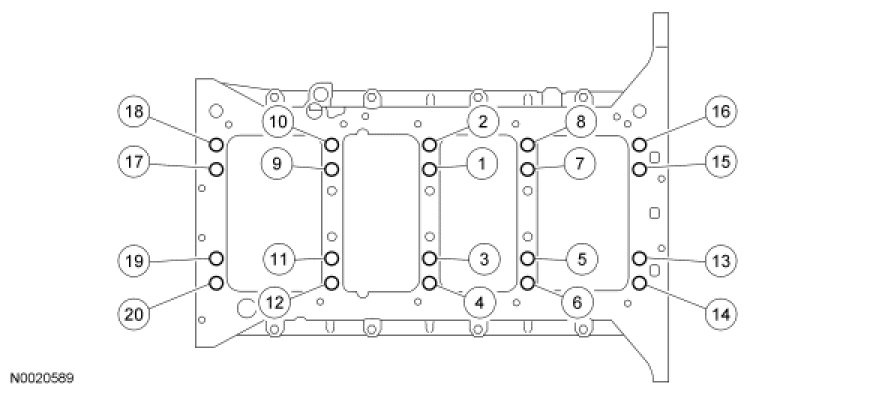 Install the lower crankcase, all 20 lower crankcase main bearing mounting bolts and tighten the bolts in 3 stages, in the sequence shown.Stage 1: Tighten to 122 Nm (90 lb-ft).