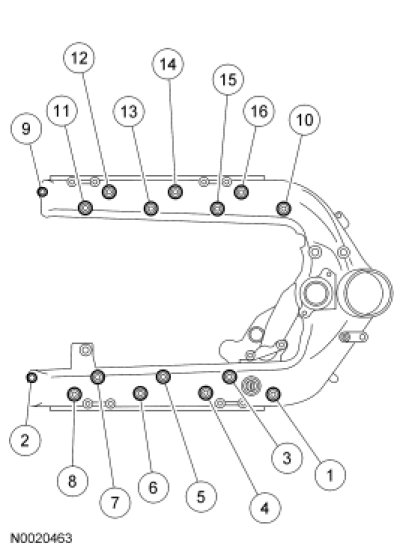 Install the intake manifold, 5 stud bolts and 11 bolts. Tighten in 3 stages, in the sequence shown.Stage 1: Loosely installed bolts 1-8.