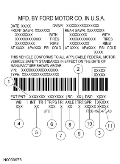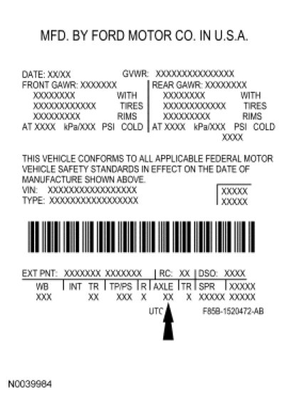 The upper portion of the Vehicle Certification (VC) label contains the manufacturer's name, the month and year of manufacture, the certification statement and the VIN. It also includes Gross Vehicle Weight Rating (GVWR). The VC label is located on the left-hand door jamb. The serial number can also be found on the engine block, transmission and frame.