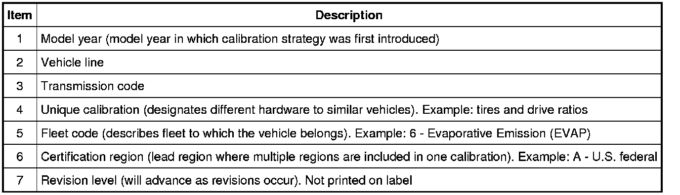 NOTE: Powertrain calibration information is limited to a maximum of 5 characters per line on the Vehicle Certification (VC) label. Because of this, calibration identification consisting of more than 5 characters will wrap to the second line on the VC label.