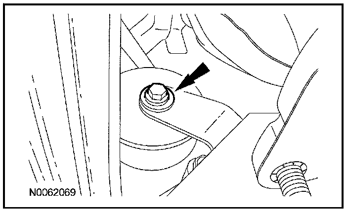 13. Remove the nut and the engine support crossmember. Discard the nut.