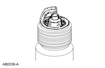 - Check for wet, black deposits on the insulator shell bore electrodes, caused by excessive oil entering the combustion chamber through worn rings and pistons, excessive valve-to-guide clearance or worn or loose bearings.