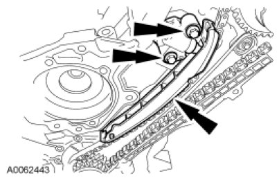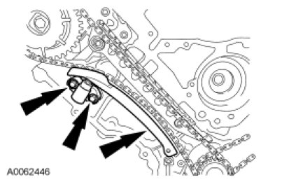 Position the RH timing chain tensioner arm on the dowel pin and install the RH timing chain tensioner and bolts.