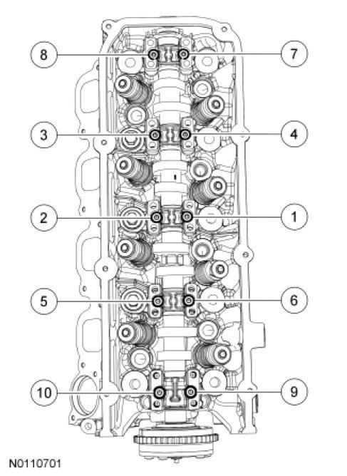 Position the 5 camshaft bearing caps in their original locations and install the 10 bolts in the sequence shown, in 2 stages.