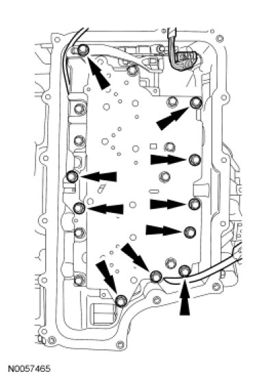 7. NOTICE: Make sure not to pinch the Turbine Shaft Speed (TSS), Output Shaft Speed (OSS) or Transmission Range (TR) sensor wiring harnesses when installing the solenoid body. Damage to the wiring harness will occur.