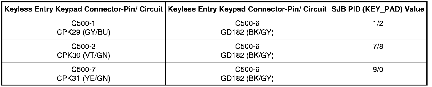 - Connect a fused jumper wire between the keyless entry keypad, harness side while monitoring the SJB PID (KEY_PAD) as follows: