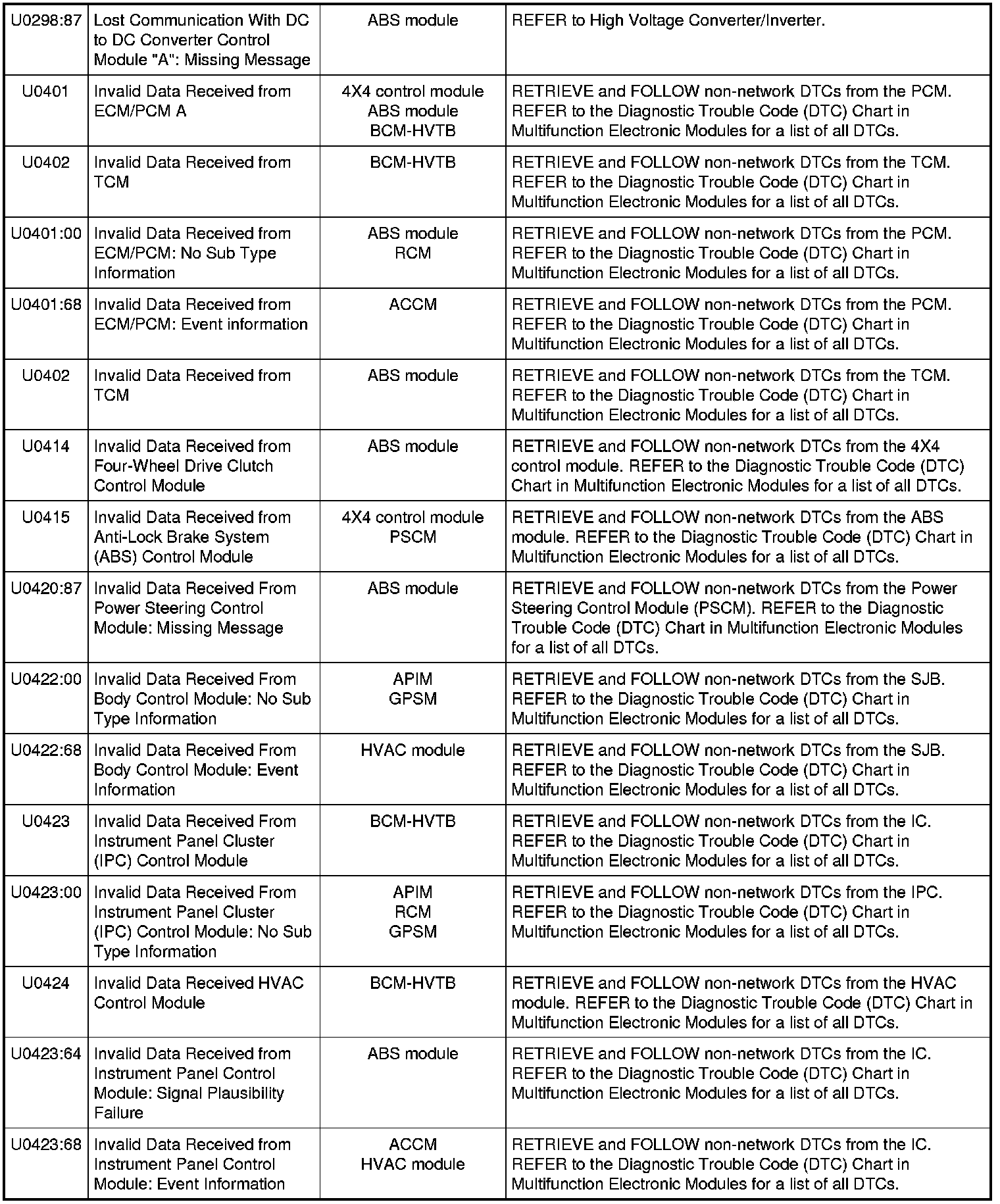NOTE: Network DTCs (U-codes) are often a result of intermittent concerns such as damaged wiring or low battery voltage occurrences. Additionally, vehicle repair procedures such as module reprogramming often set network DTCs. Replacing a module to resolve a network DTC is unlikely to resolve the concern. To prevent repeat network DTC concerns, inspect all network wiring, especially connectors. Test the vehicle battery, refer to Battery, Mounting and Cables Testing and Inspection.