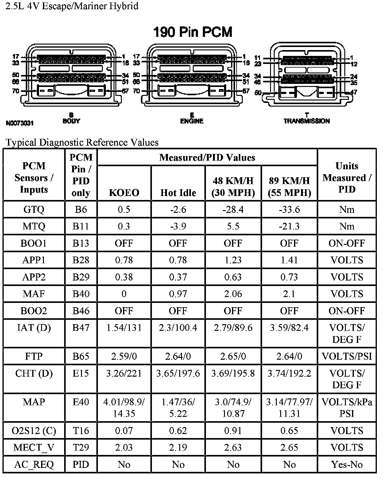 The Typical Diagnostic Reference Value Charts do not display fault parameter identifications (PIDs). These are PIDs which indicate a hard fault with the circuit. They display a value of YES or NO and are PIDs ending with an F.