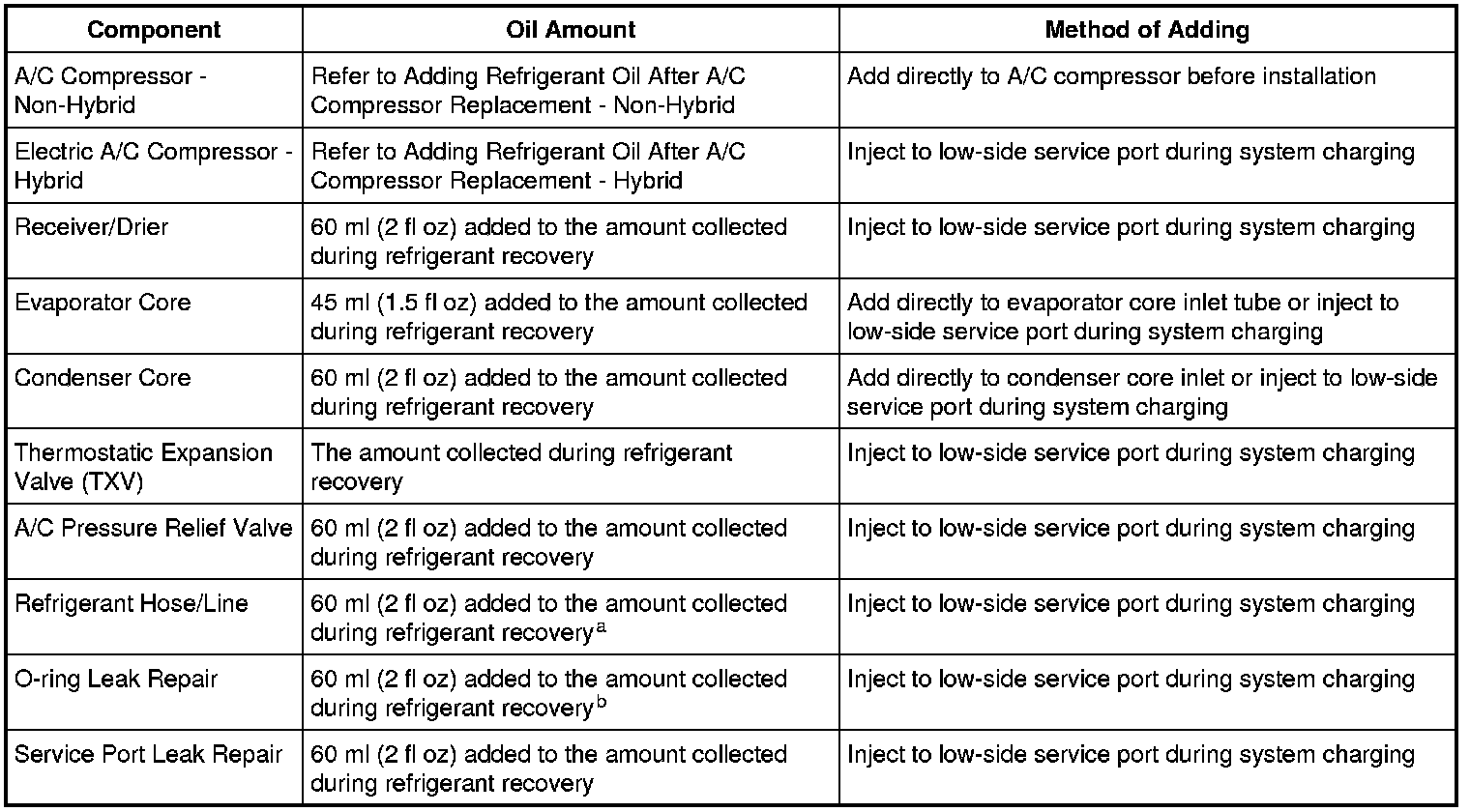 b The amount specified may be used for one or multiple O-ring leak repairs. Do not multiply the refrigerant oil amount by the number of O-ring leaks being repaired.