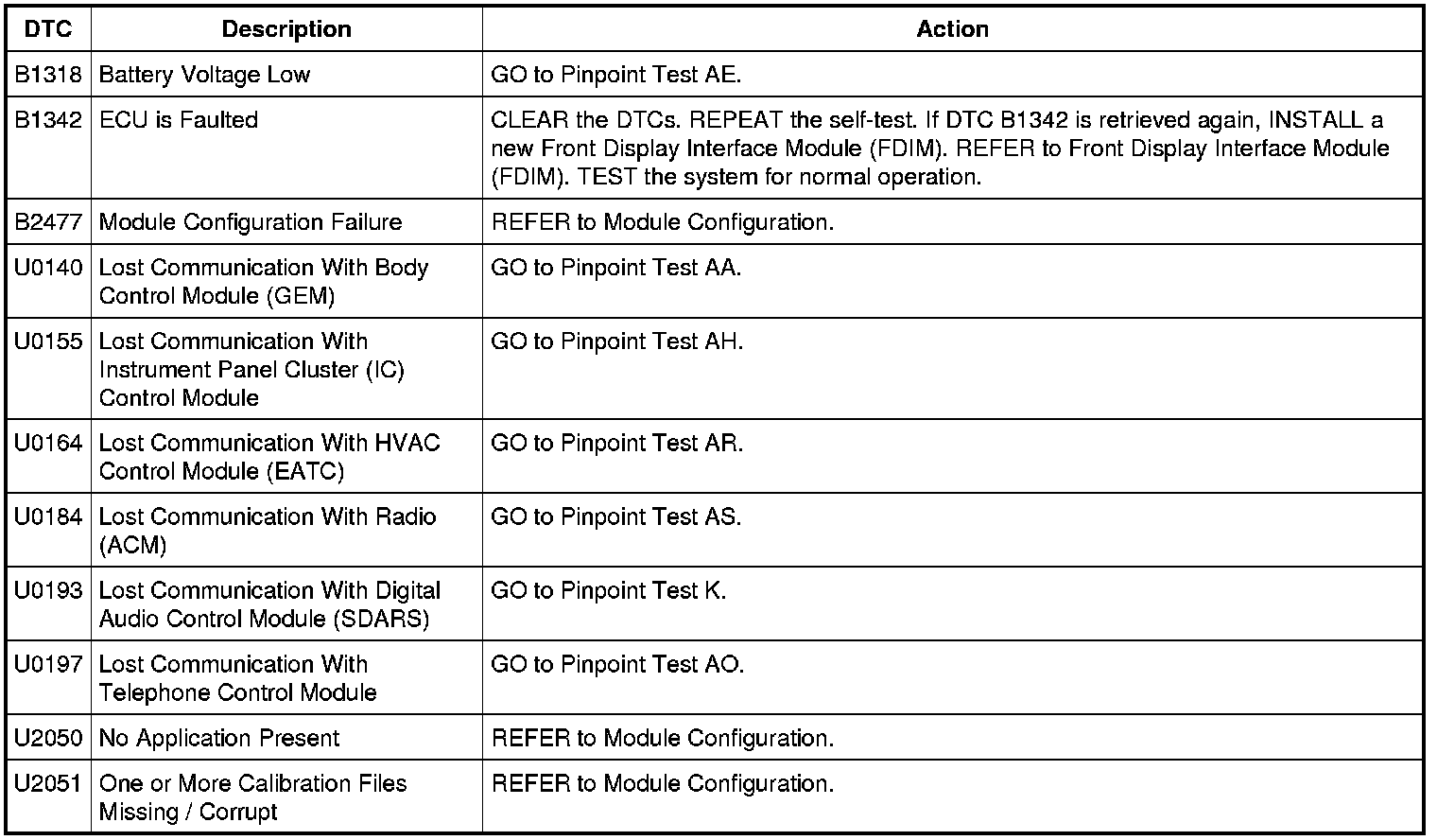Front Display Interface Module (FDIM) DTC Chart