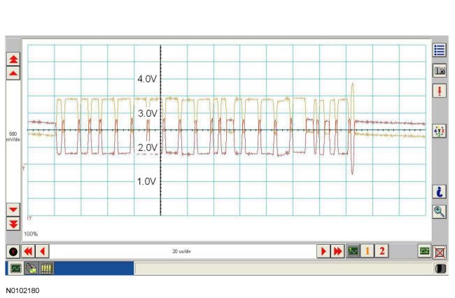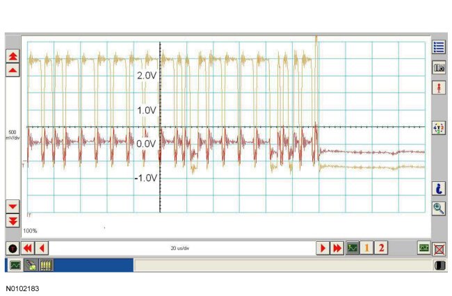 NOTE: The oscilloscope traces below are from the Integrated Diagnostic System (IDS) oscilloscope taken using the IDS pre-configured Controller Area Network (CAN) settings. The traces are for both data (+) and data (-) taken simultaneously (2-channel) at a sample rate of 1 mega-sample per second (1MS/s) or greater.