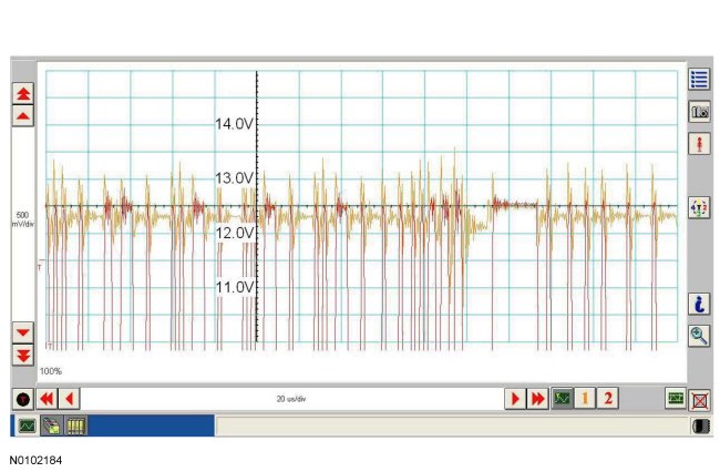 Traces below are viewed at 500mV per division (vertical axis) and 20 microseconds (20µs) per division (horizontal axis). Readings taken with a different oscilloscope vary from those shown. Compare any suspect readings to a known good vehicle.
