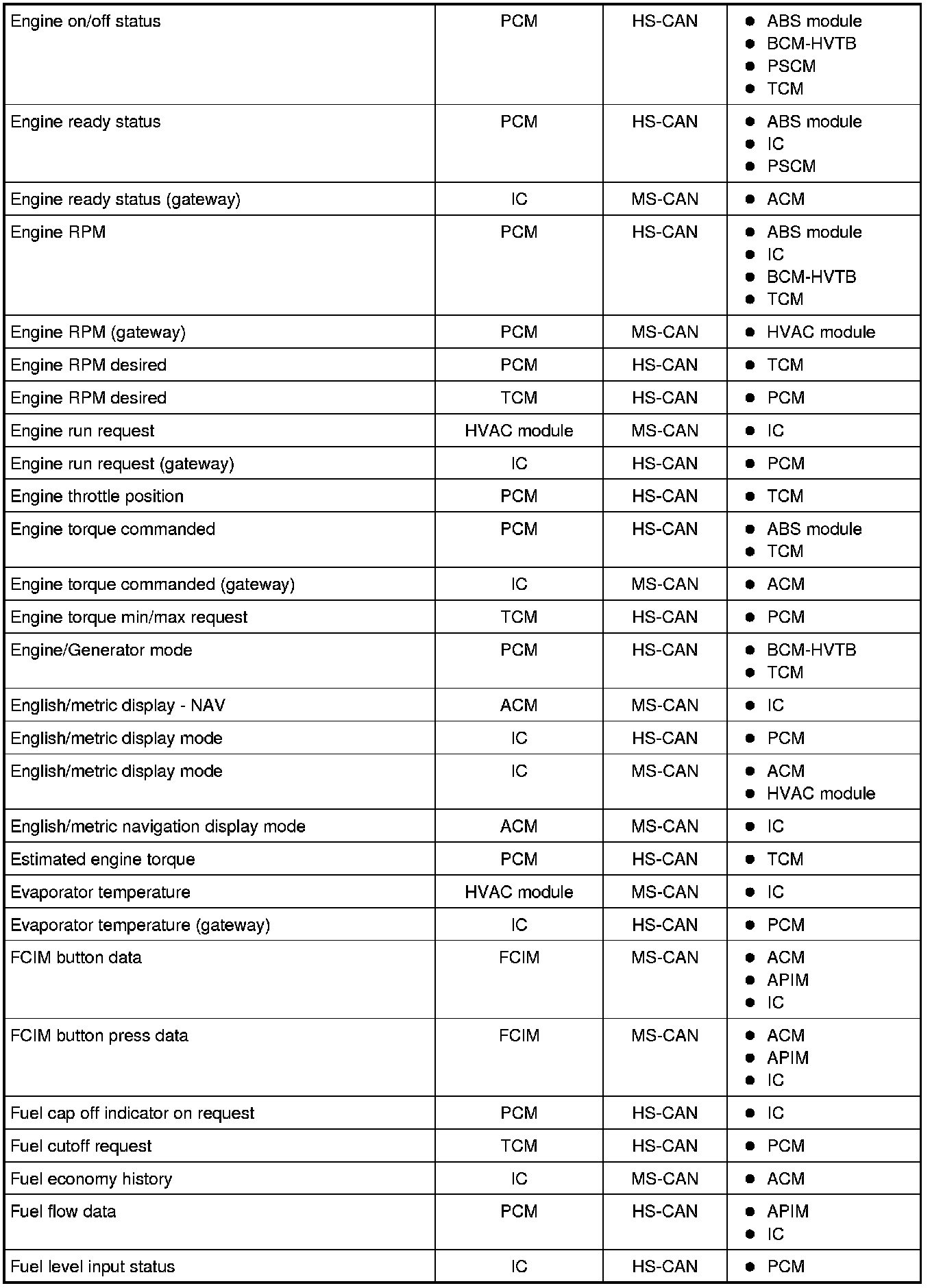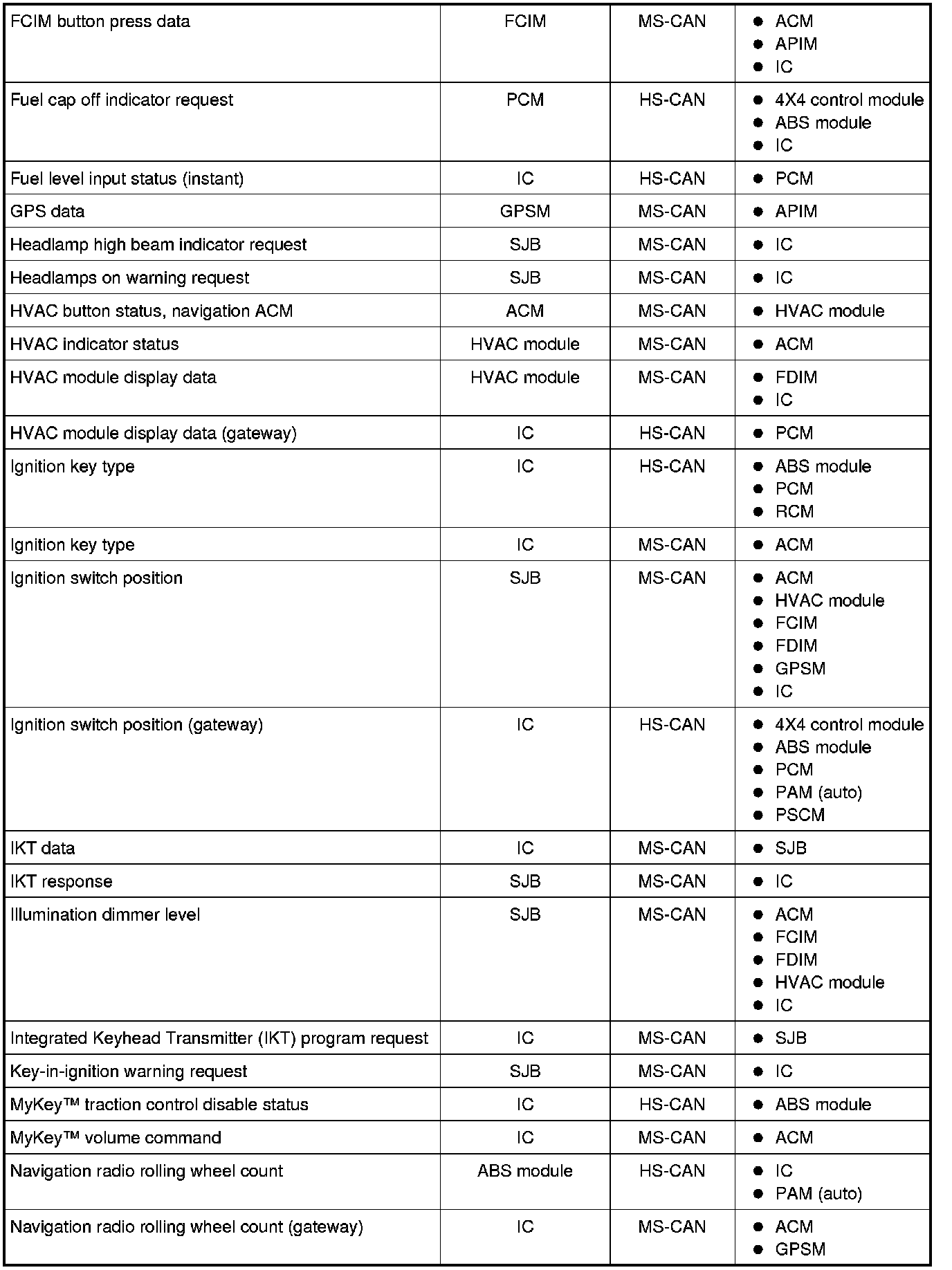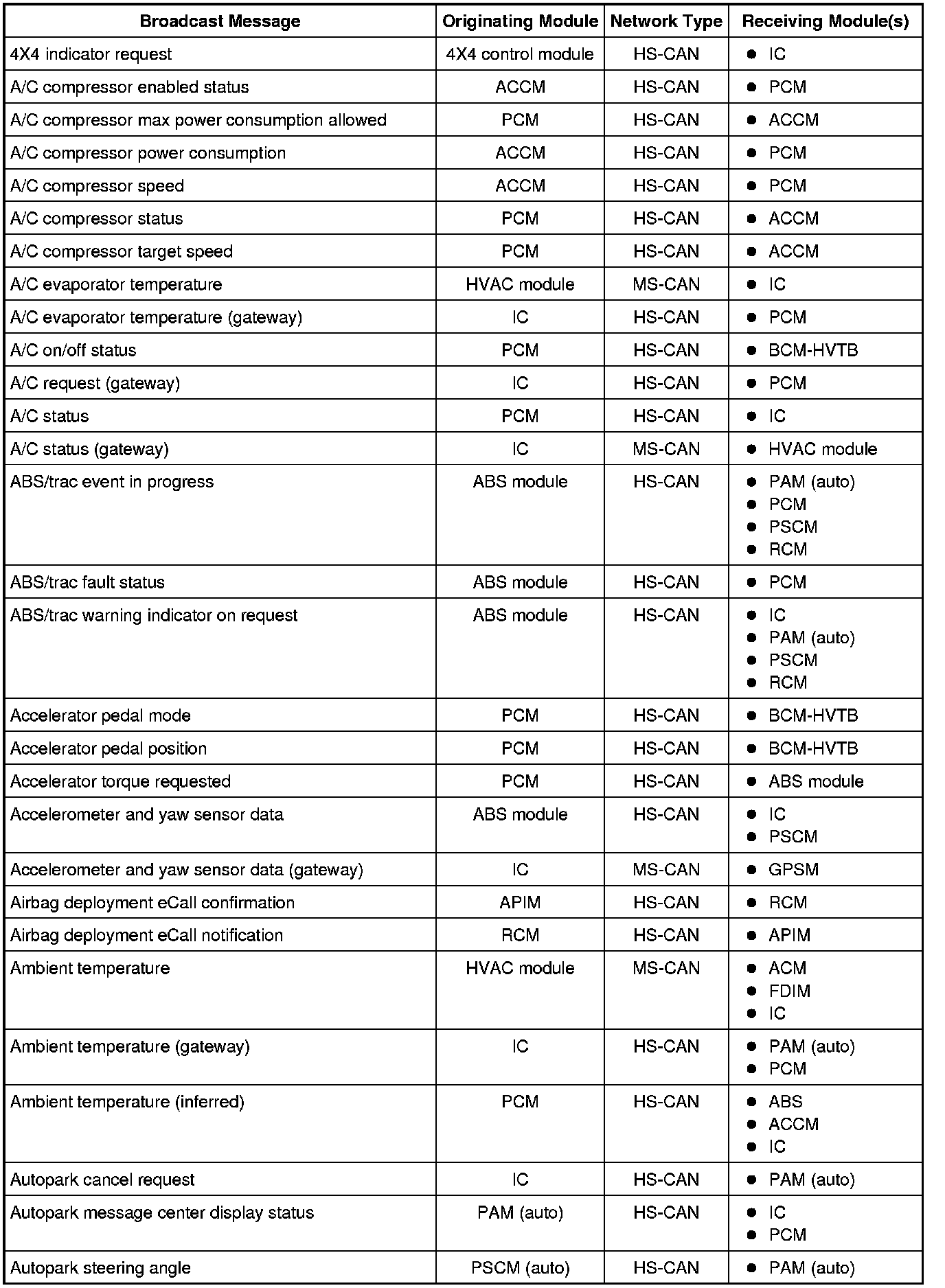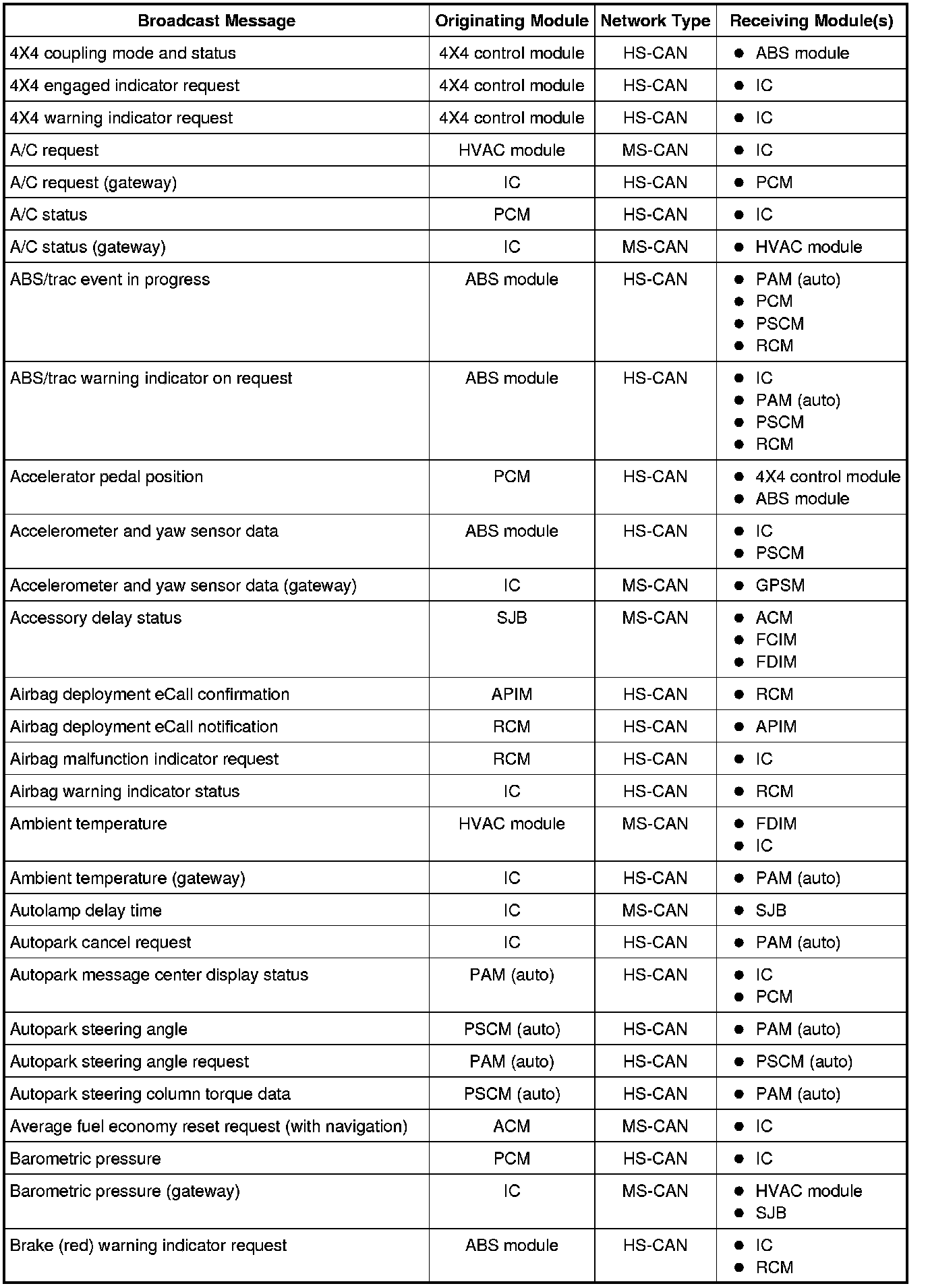 Modules on the CAN utilize simultaneous communication of 2 or more messages on the same network circuits. The following chart summarizes the messages sent and received on the network.