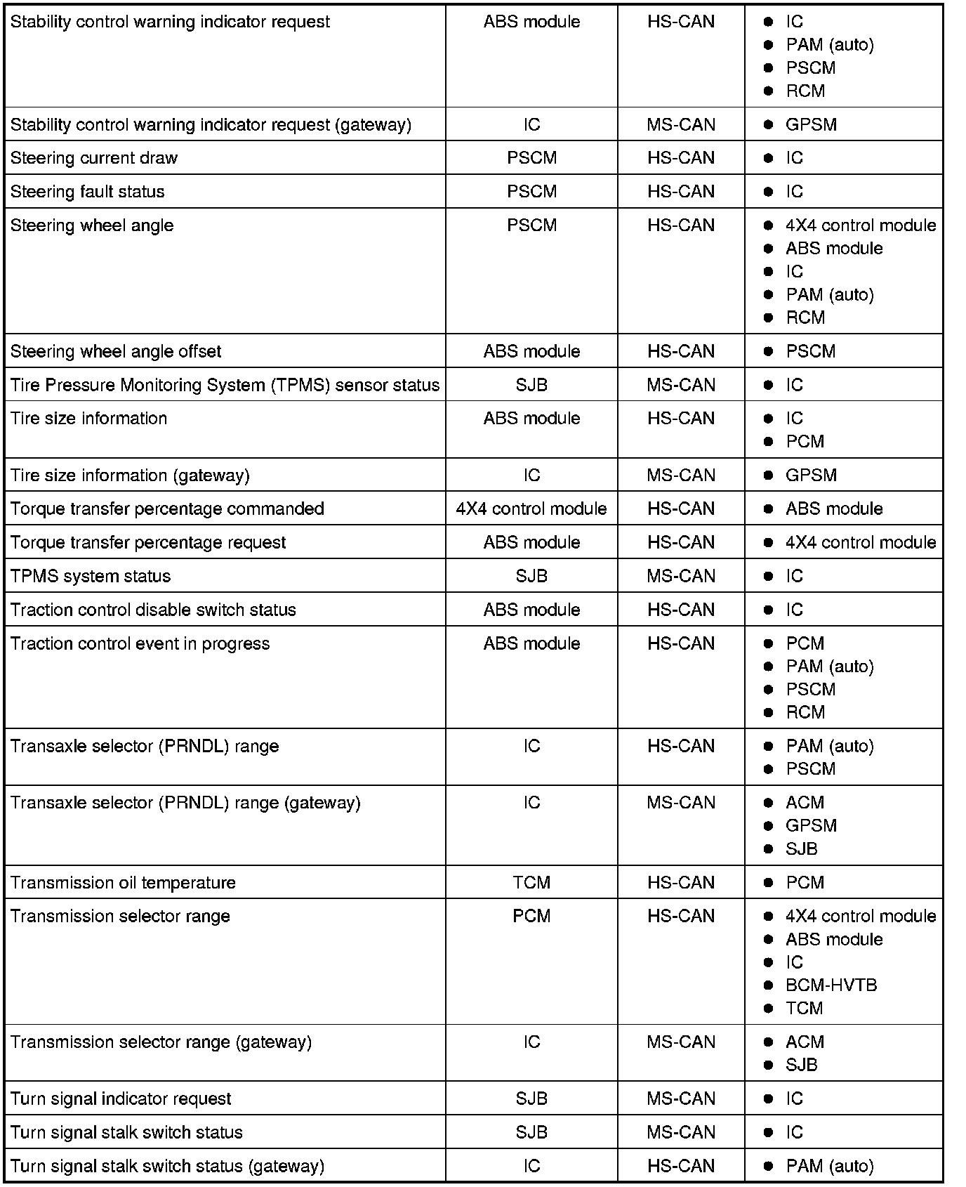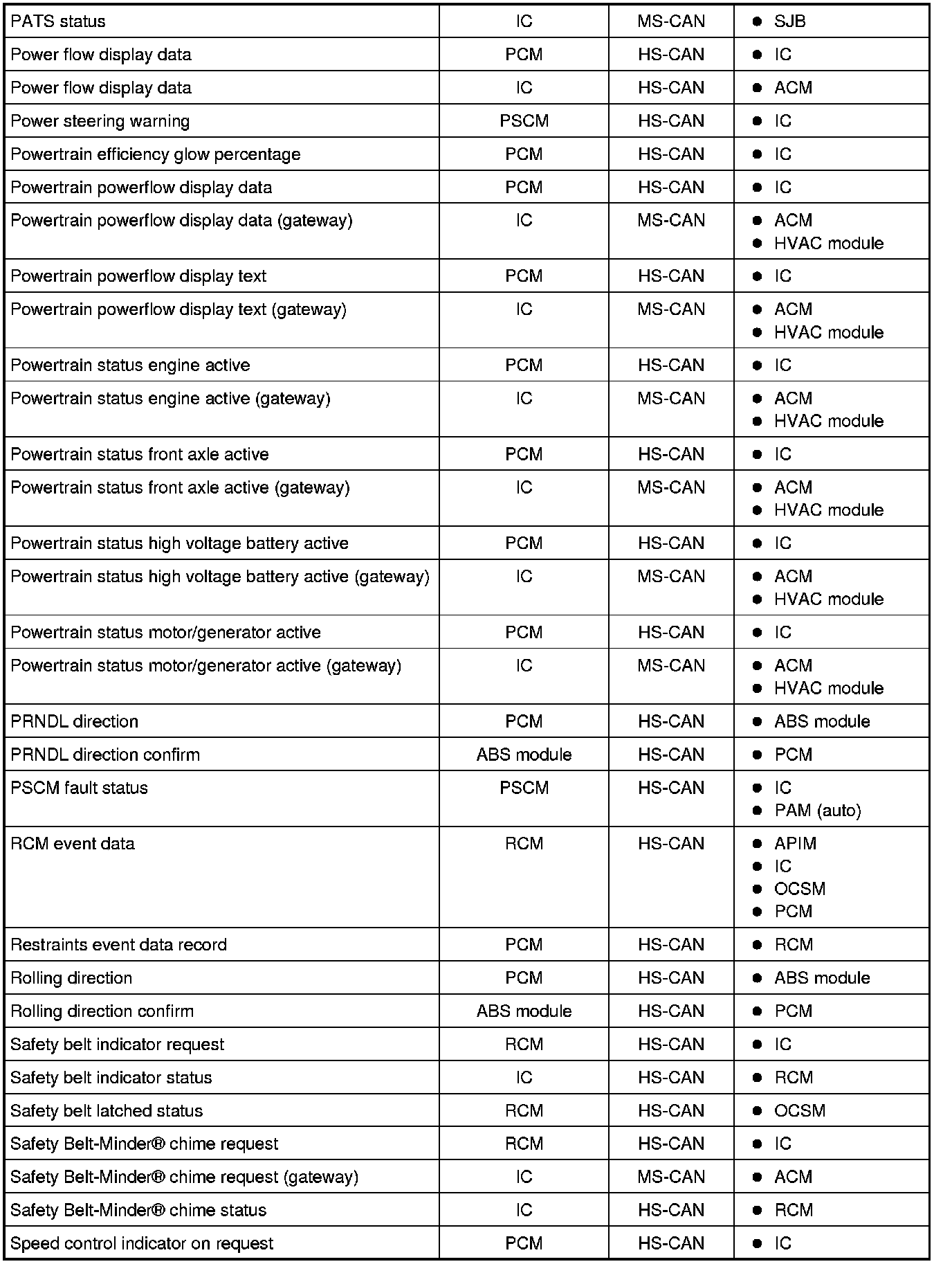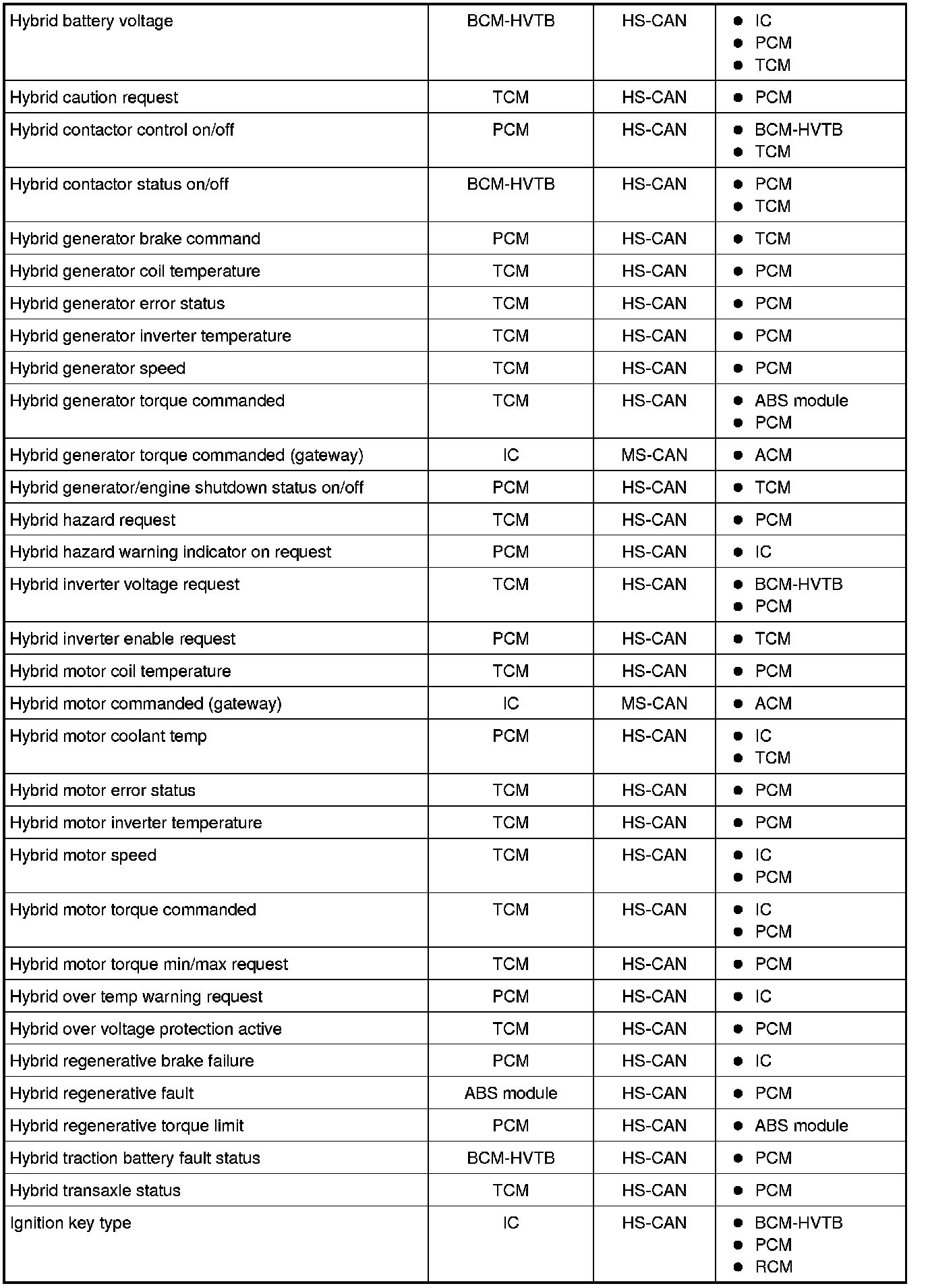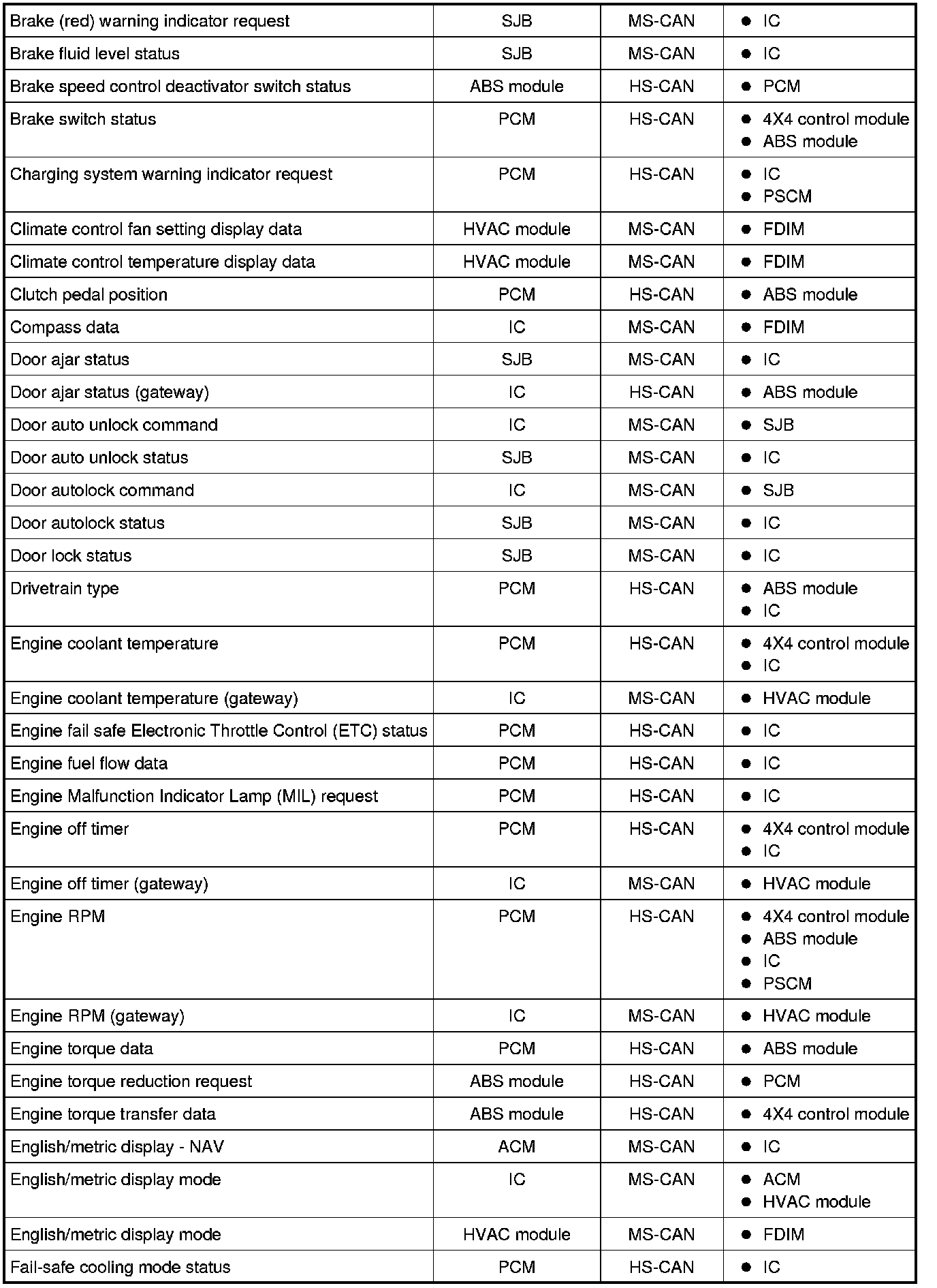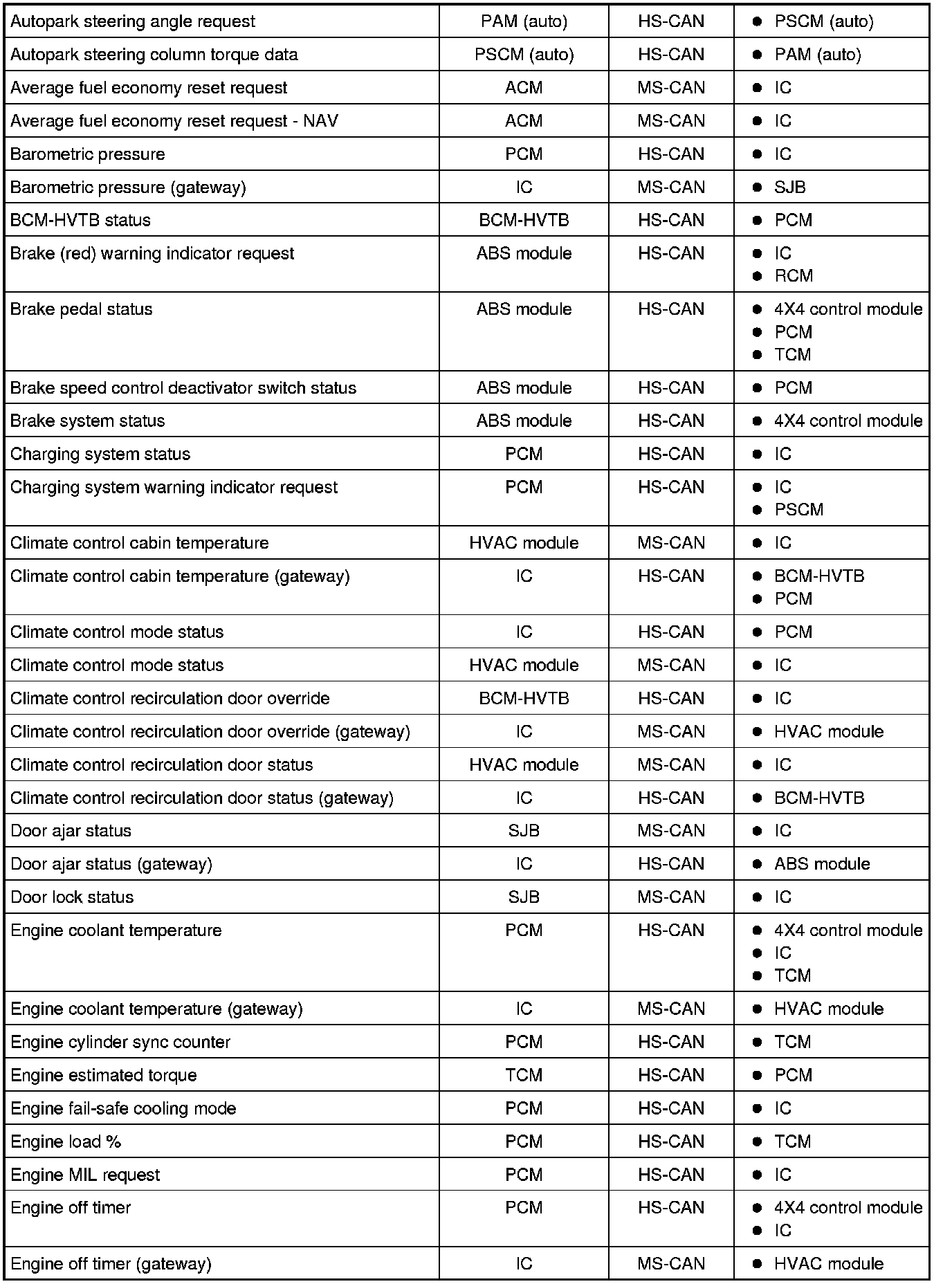 Modules on the CAN utilize simultaneous communication of 2 or more messages on the same network circuits. The following chart summarizes the messages sent and received on the network.