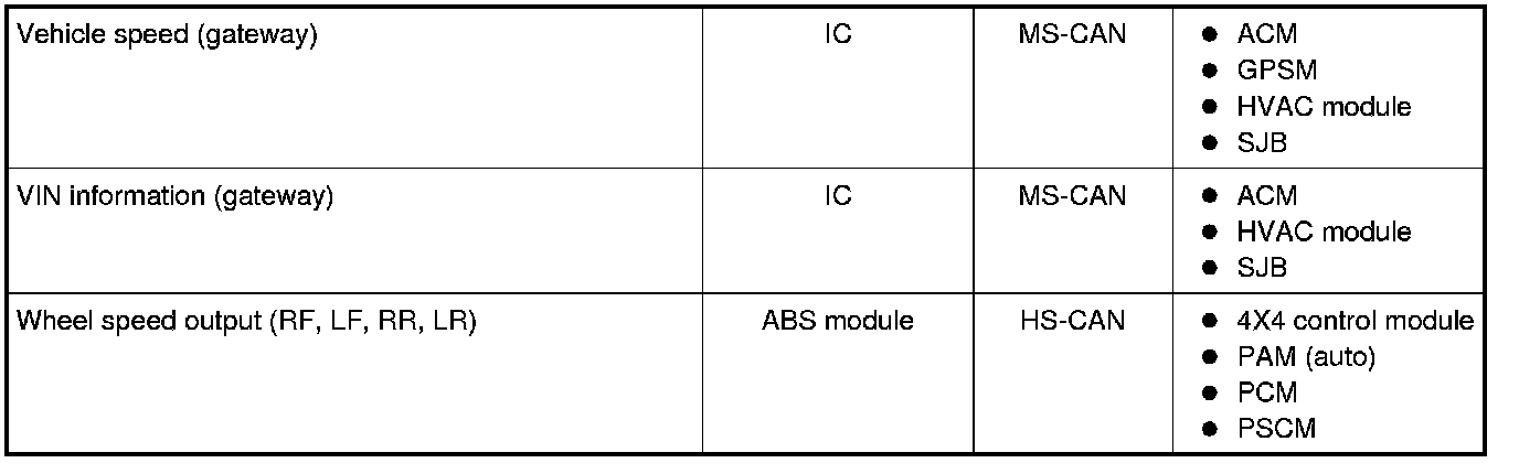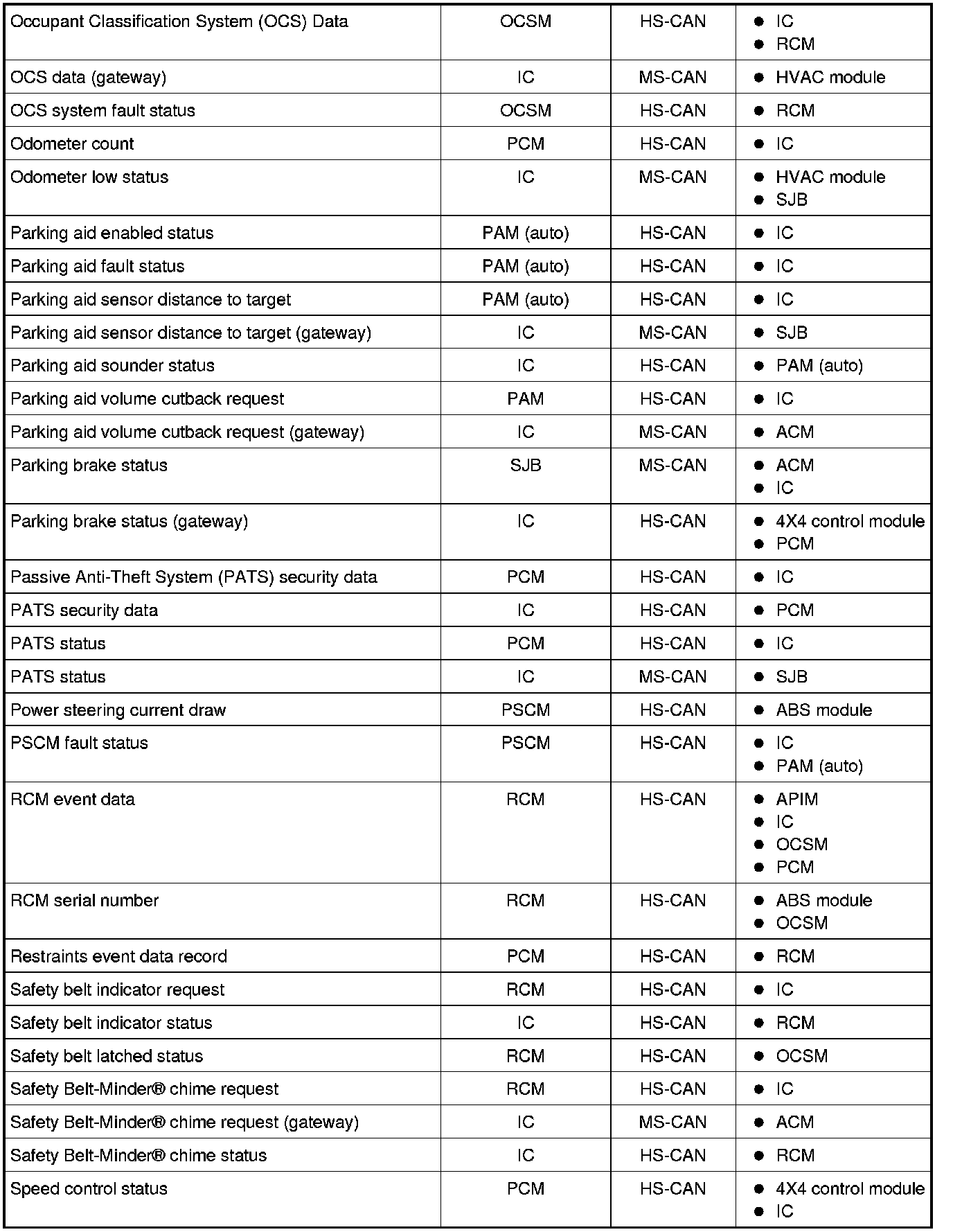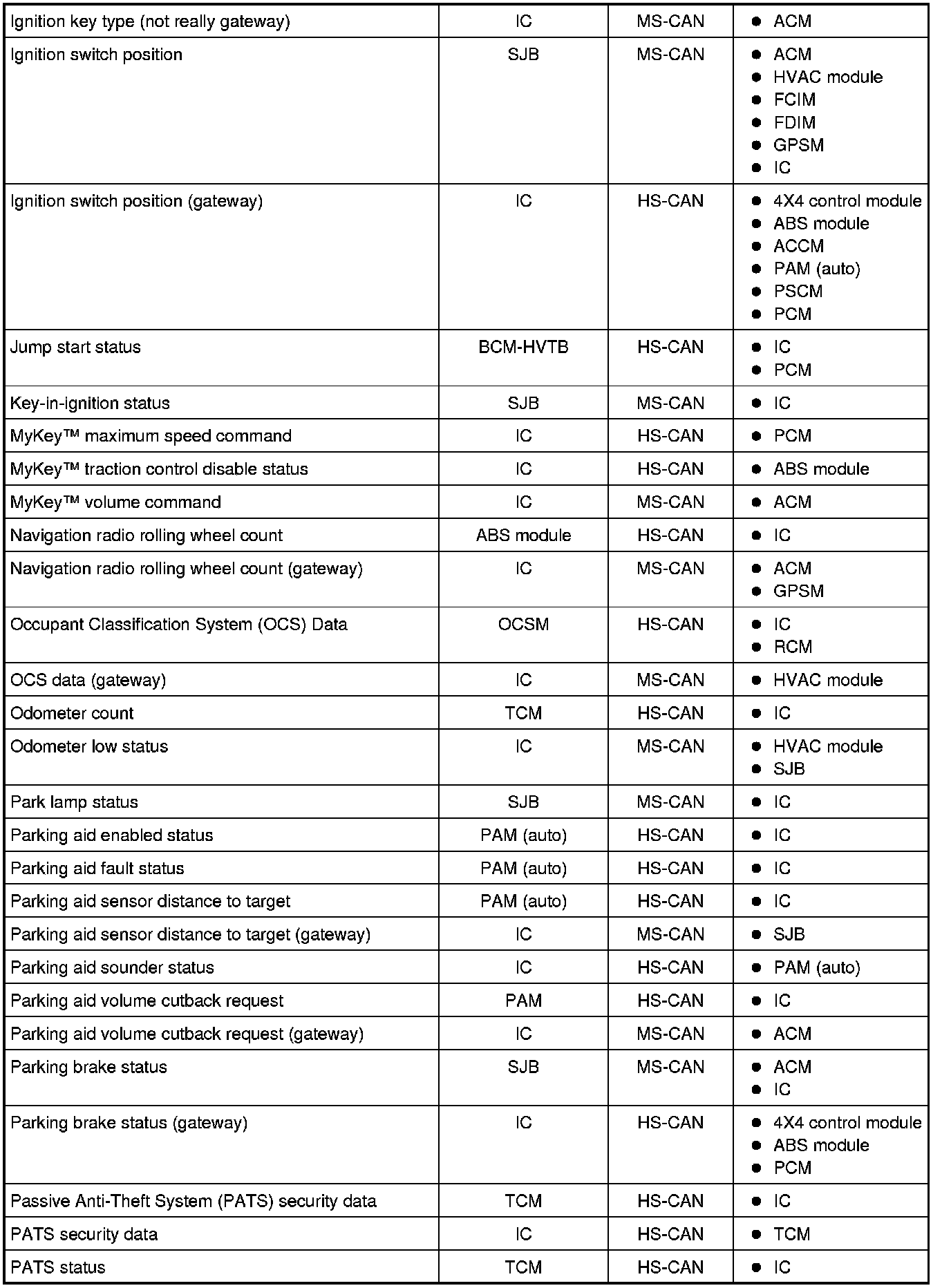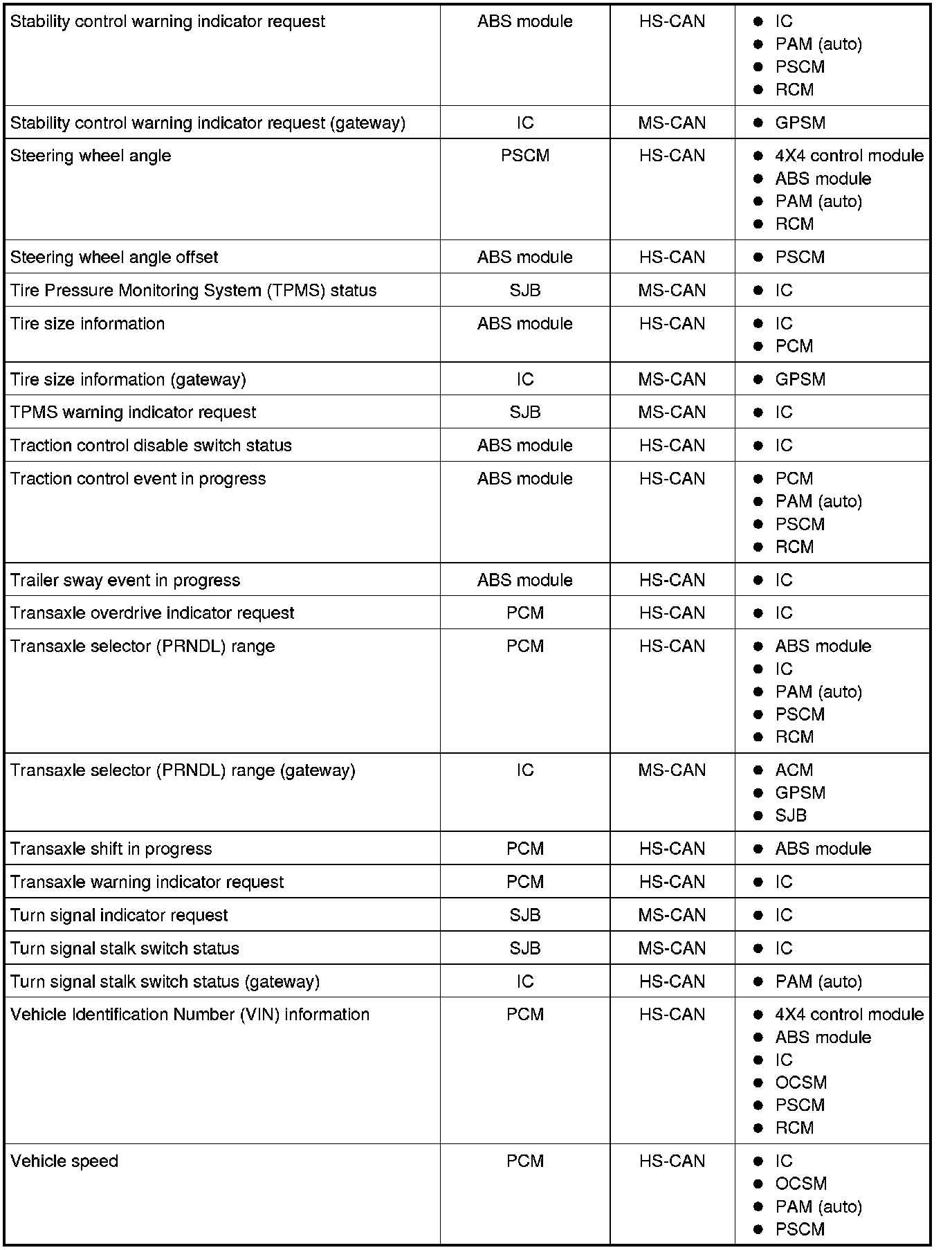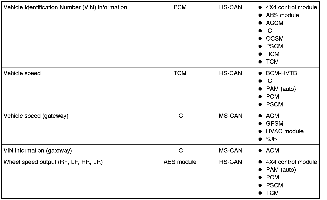 Modules on the CAN utilize simultaneous communication of 2 or more messages on the same network circuits. The following chart summarizes the messages sent and received on the network.