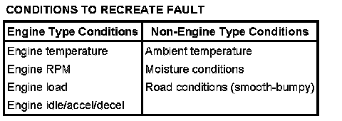 Recreating the fault is the first step in isolating the cause of the intermittent symptom. A thorough investigation should start with the customer information worksheet located in the back of the book. If freeze frame data is available, it may help in recreating the conditions at the time of a malfunction indicator lamp (MIL) diagnostic trouble code (DTC). Listed below are some of the conditions for recreating the fault:
