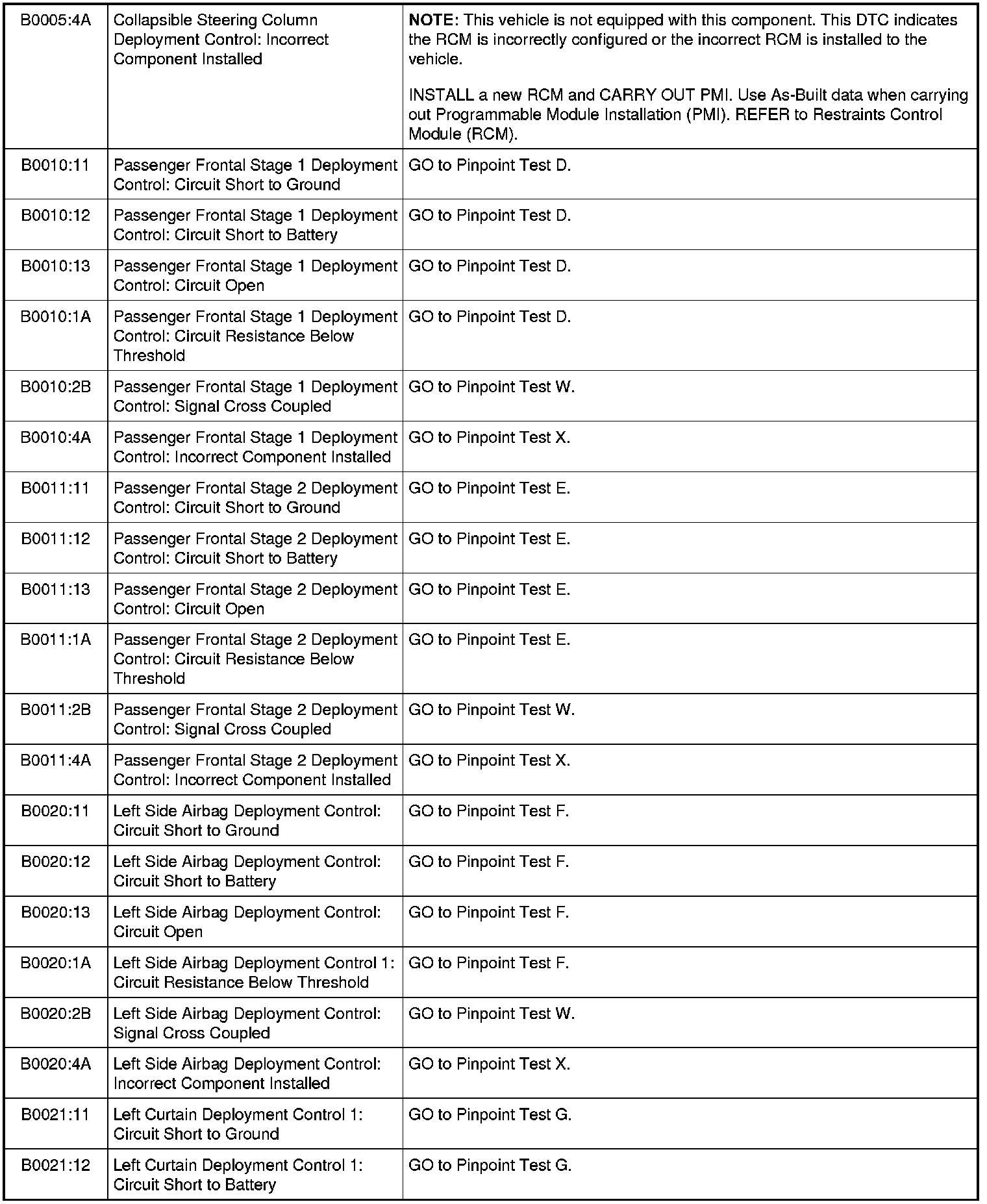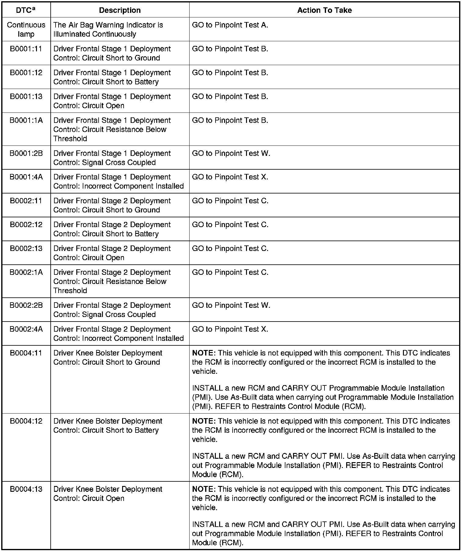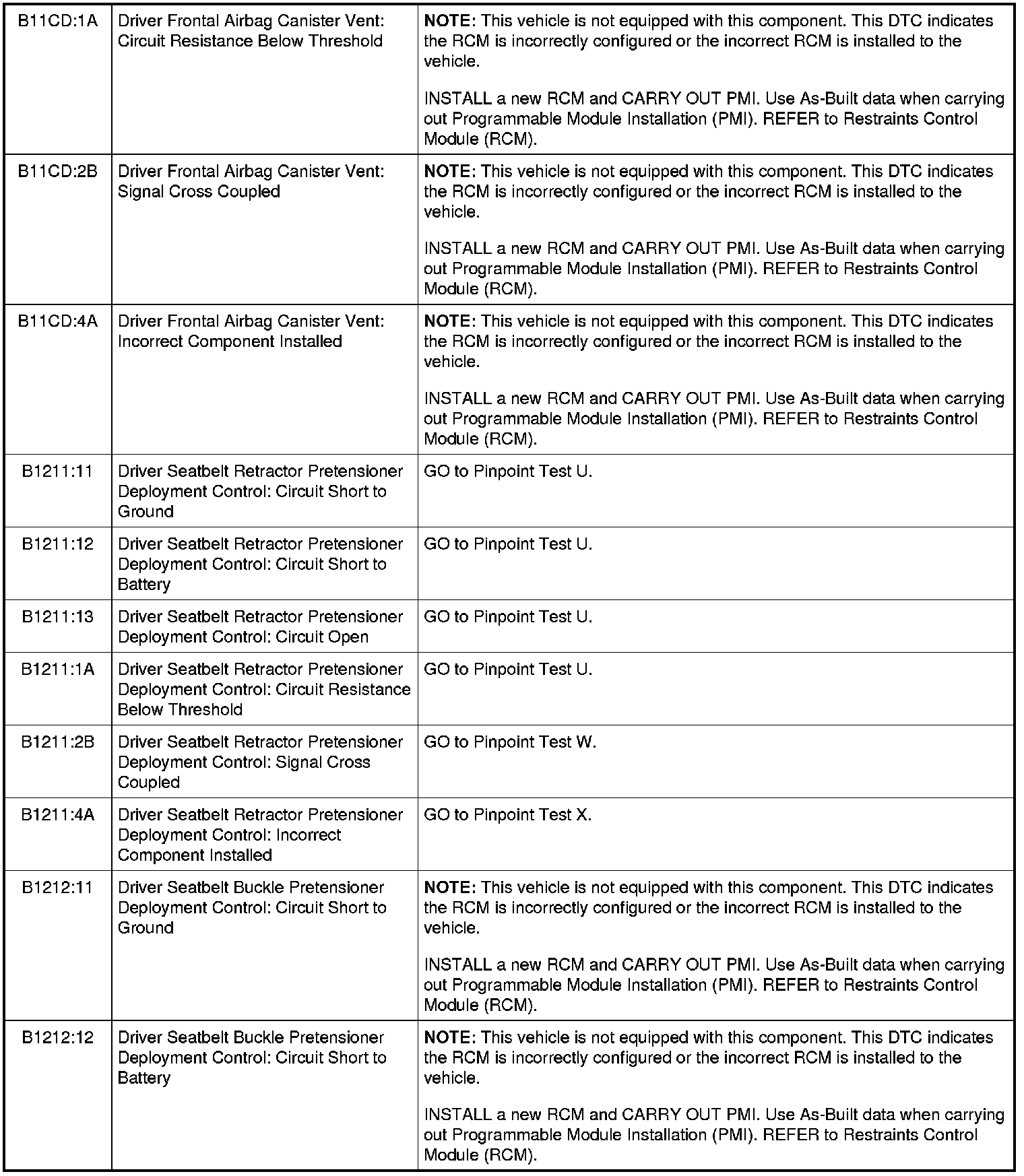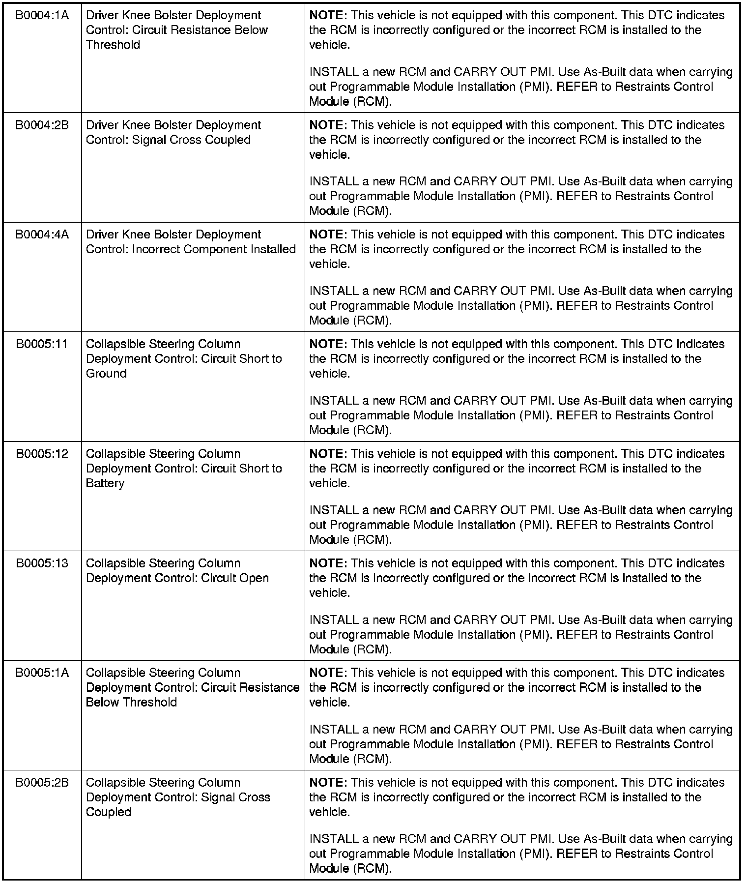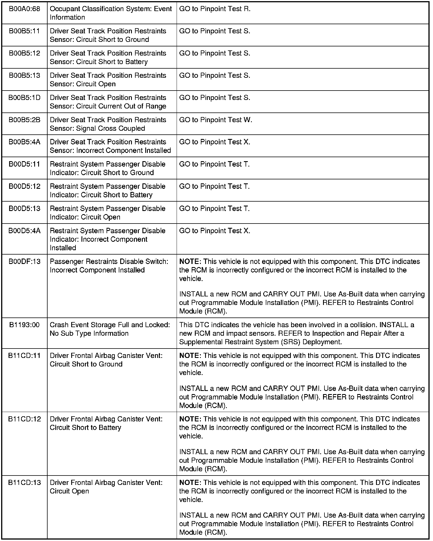 Restraints Control Module (RCM) DTC Chart