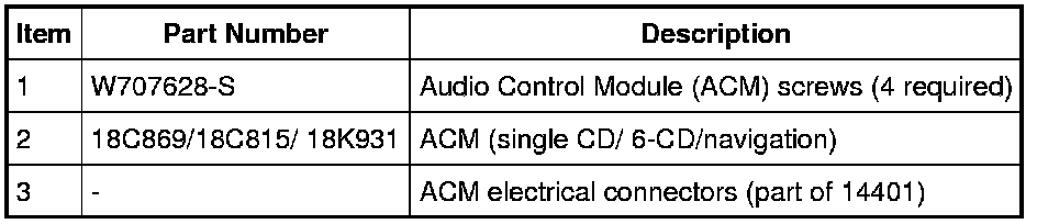 NOTE: It is not necessary to remove the Audio Control Module (ACM) to retrieve the part number. For additional information, refer to Audio Control Module (ACM) Self-Diagnostic Mode Audio Control Module (ACM) Self-Diagnostic Mode.
