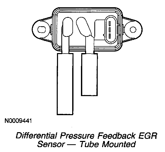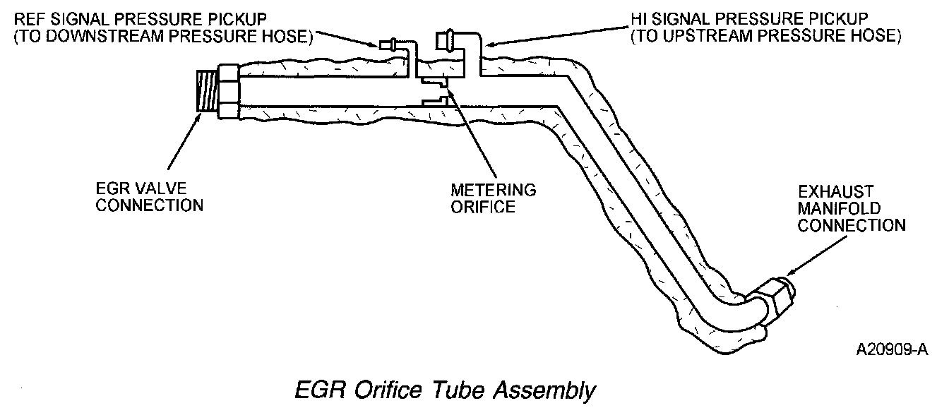 The EGR orifice tube assembly is a section of tubing connecting the exhaust system to the intake manifold. The assembly provides the flow path for the EGR to the intake manifold and also contains the metering orifice and 2 pressure pick-up tubes. The internal metering orifice creates a measurable pressure drop across it as the EGR valve opens and closes. This pressure differential across the orifice is picked up by the differential pressure feedback EGR sensor which provides feedback to the PCM.