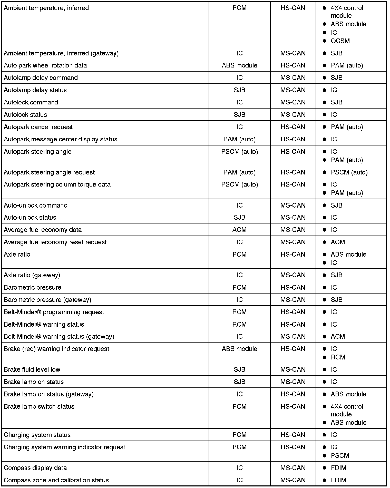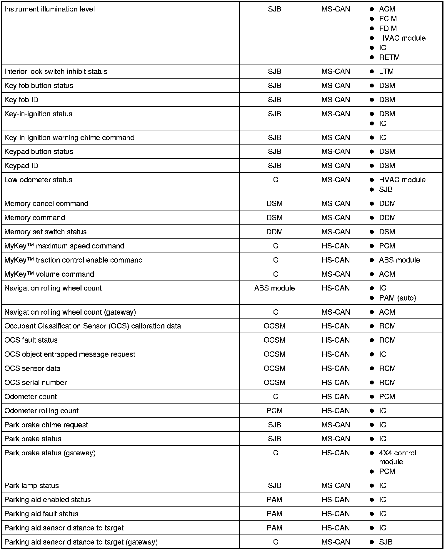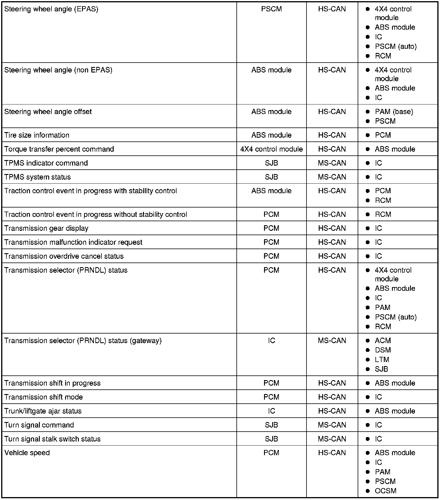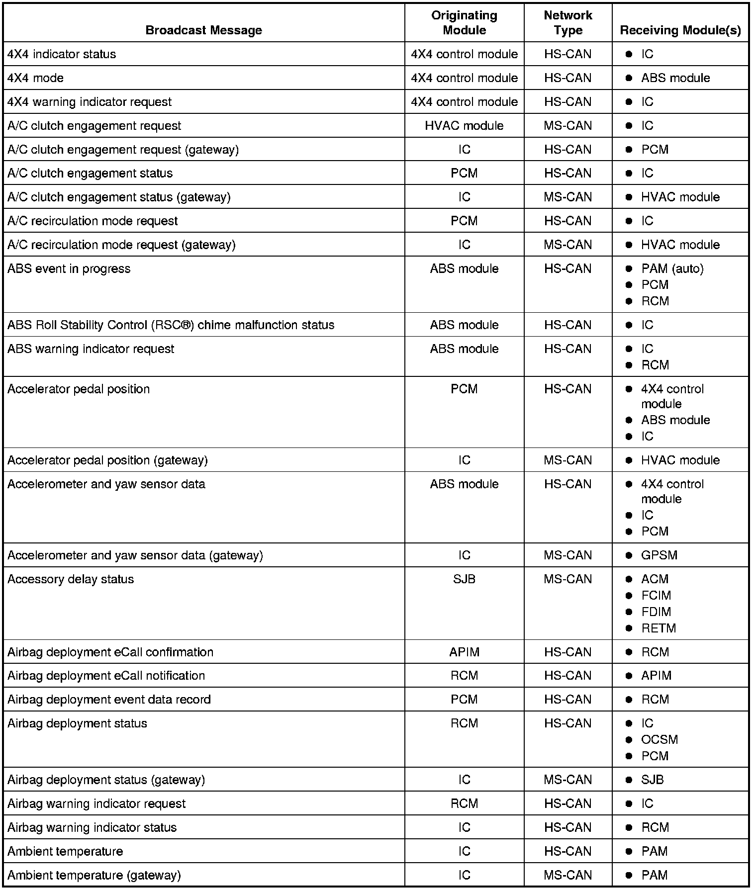 NOTE: This chart describes the specific HS-CAN and MS-CAN messages broadcast by each module, and the module(s) that receive the message.