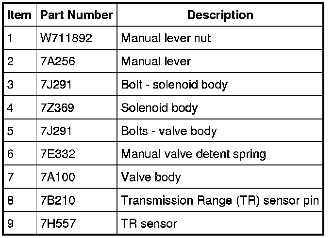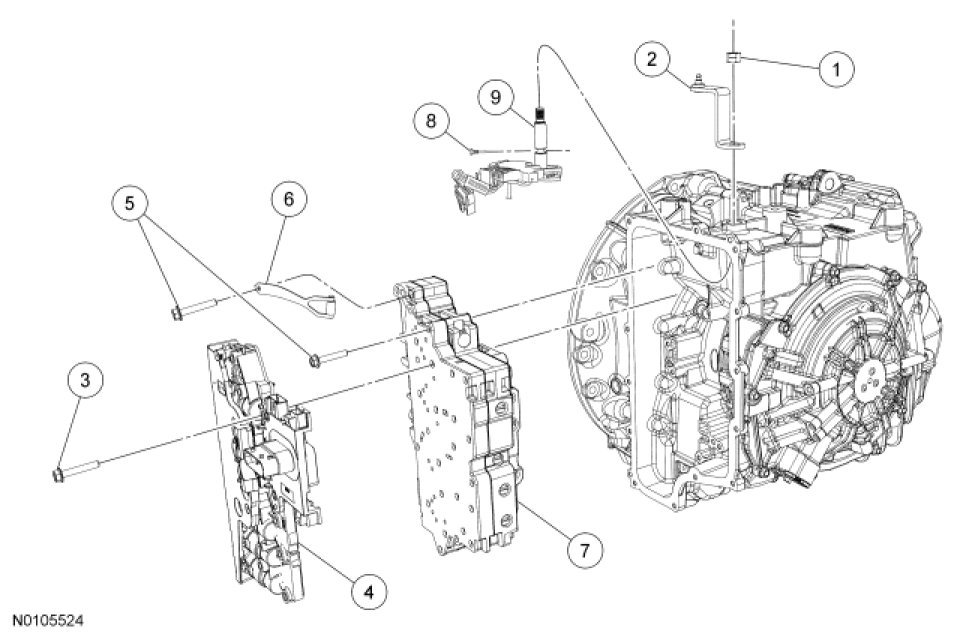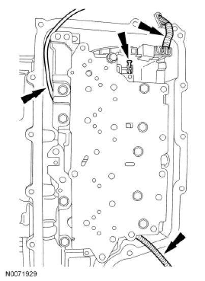 7. NOTICE: Make sure not to pinch the Turbine Shaft Speed (TSS), Output Shaft Speed (OSS) or Transmission Range (TR) sensor wiring harnesses when installing the solenoid body. Damage to the wiring harness will occur.