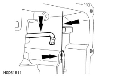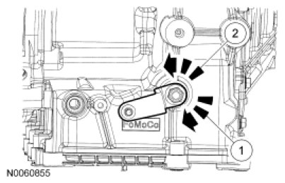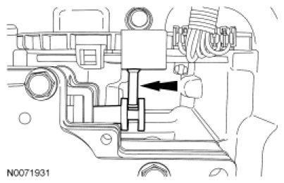 11. NOTICE: Make sure that the park pawl actuator rod does not become disengaged from the park pawl and the abutment, or transaxle removal and disassembly is required to reinstall the actuator rod.