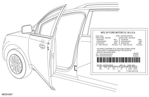 The upper portion of the Vehicle Certification (VC) label contains the manufacturers name, the month and year of manufacture, the certification statement and the Vehicle Identification Number (VIN). It also includes the Gross Vehicle Weight Rating (GVWR). The VC (Vehicle Certification) label is located on the LH door jamb.