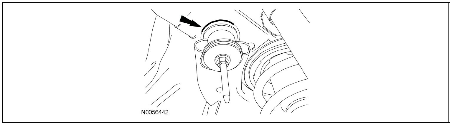 7. NOTICE: Do not allow the brake caliper and anchor plate assembly to hang from the brake hose or damage to the hose may occur.