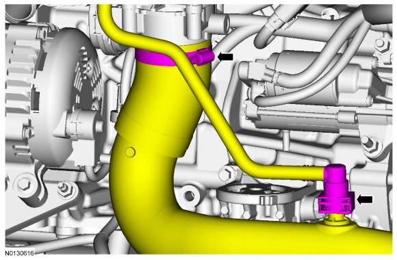 - Loosen the clamp and disconnect the CAC (Charge Air Cooler) outlet tube from the TB (Throttle Body).