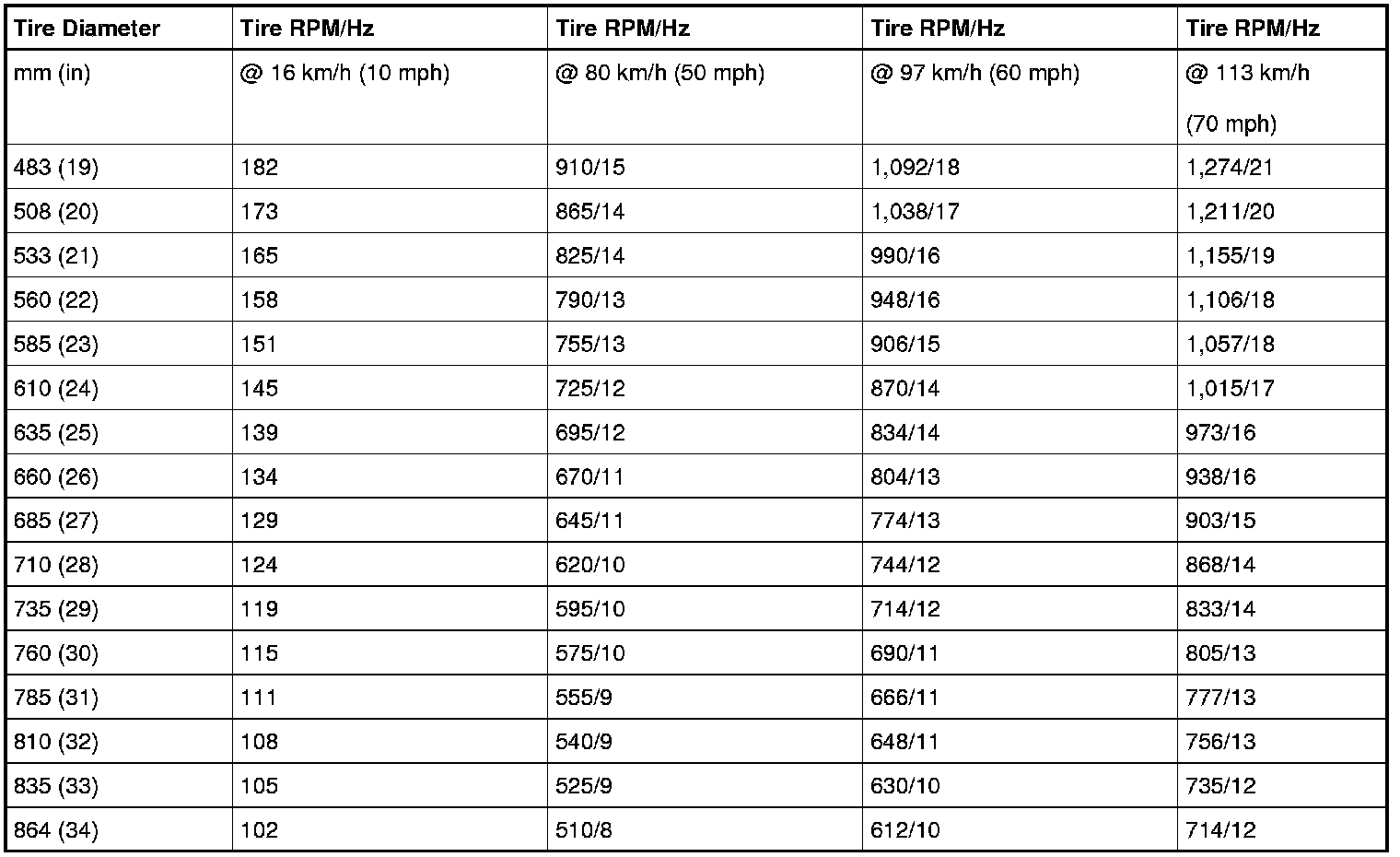 - If the vehicle speed is not listed, calculate the tire and wheel frequency as follows: