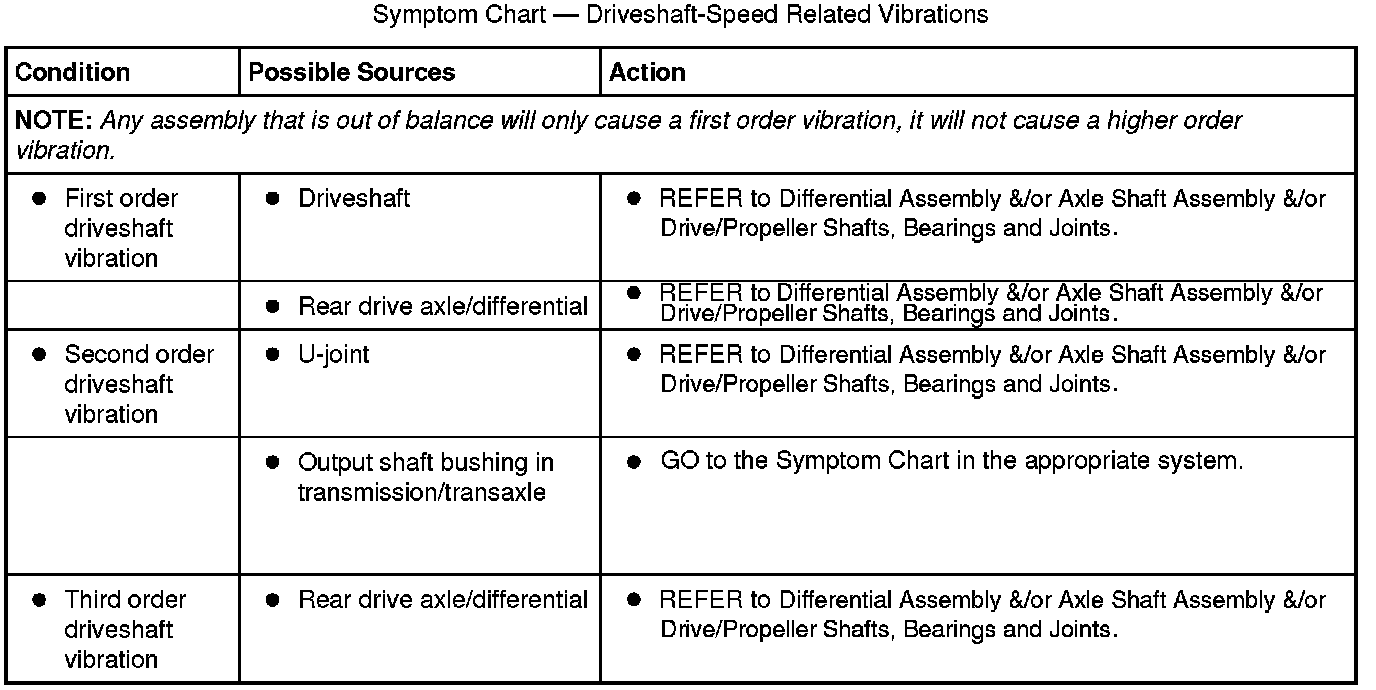 Use the diagnostic instructions along with the necessary listed tools to identify the vibration order and to isolate the symptom and the possible systems associated with that symptom. Then based on the results from the road test, make a determination of which action in the symptom chart to take first. Since it is possible any one of multiple systems may be the cause of the symptom, it may be necessary to use a process of elimination type diagnostic approach to pinpoint the concern. Refer to the system(s) indicated to identify and isolate the cause or rule that system out as being the causal system for the symptom.