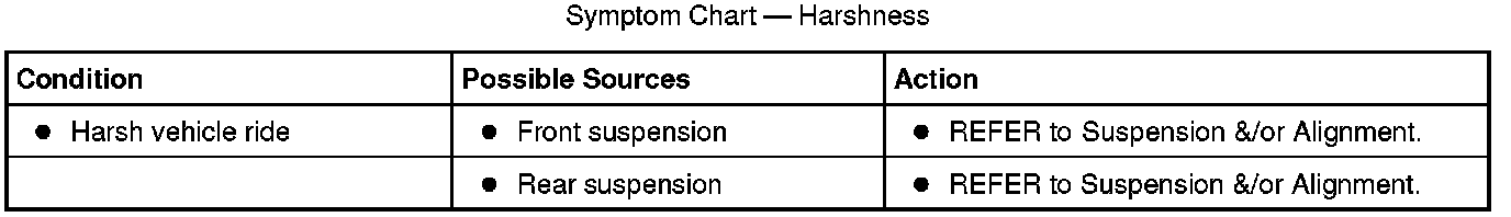 Harshness is customer perception which gives the impression of no isolation from the tire/wheel and suspension system. Harshness may be caused by road conditions, temperature changes, component damage and/or incorrect customer modifications on original components/specifications. Customers usually experience harshness when the vehicle is driving over bumps or potholes and in cold weather conditions. Harshness can also be experienced with excessive tire pressure, sporty tires, heavy-duty springs and shocks, or other vehicle modifications. Some aftermarket tires, even with the correct size, may change vehicle behavior and produce customer concerns. The first step in diagnosing a harshness concern is to determine if the concern was experienced only in certain specific operating conditions, such as large potholes or extremely cold weather. In these cases, harshness should be considered normal. A known good vehicle can be driven under the same conditions and the rides can be compared to determine whether the concern is normal or vehicle specific. The second step is to check tire pressure and make sure it was set within vehicle specifications. The third step is to inspect for aftermarket or modified components and determine if they are the cause of the harshness complaint. If the harshness concern persists after the above steps, it is possible that some components are damaged. Based on the results from the road test, make a determination of which action in the symptom chart to take first.