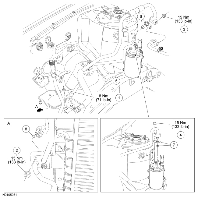 7. Remove the receiver/drier inlet fitting nut and disconnect the fitting.