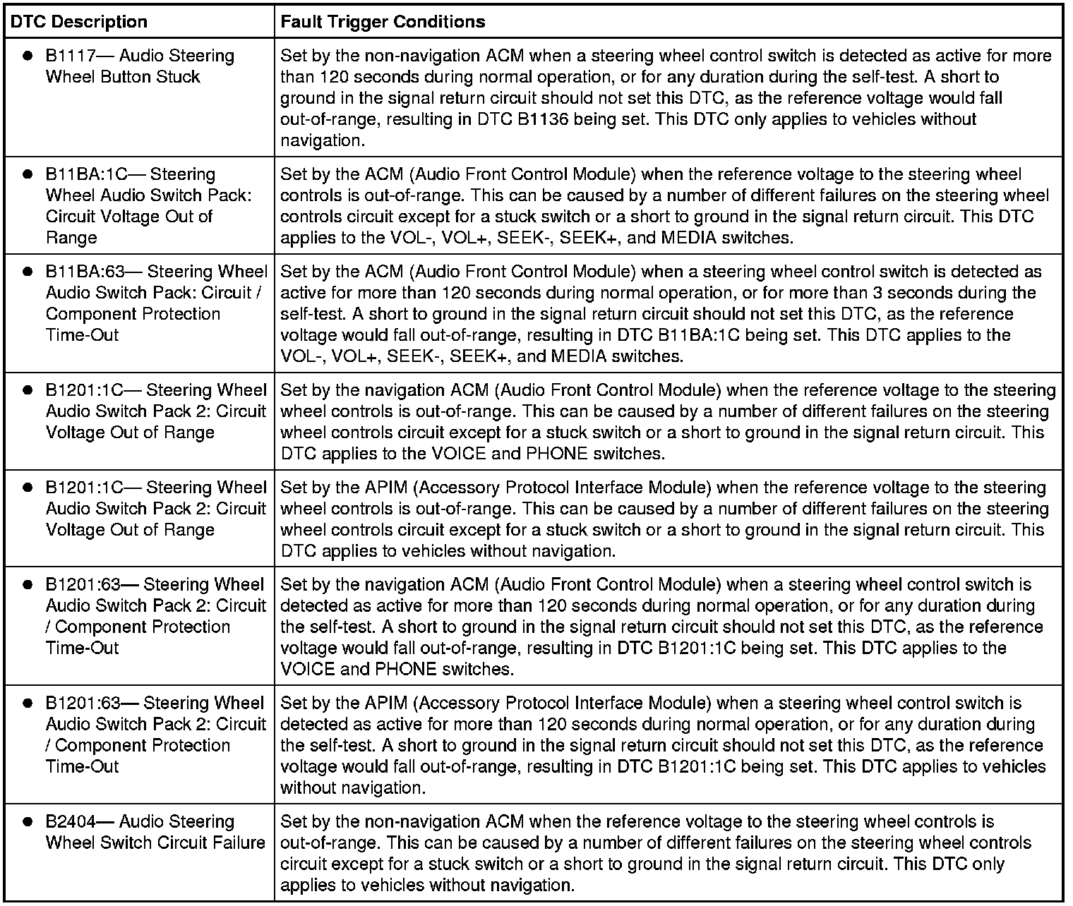 Voltage is sent from the APIM (or ACM) to the steering wheel controls and the same module grounds the return circuit. The VOL-, VOL+, SEEK- and SEEK+ switches share signal and return circuits, while the VOICE, MEDIA, PHONE and OK switches share separate signal and return circuits.