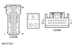 Positive Meter Lead Negative Meter Lead Circuit C3338-23 C240B-9, then ground VME53 (VT/GN) C3338-24 C240B-10, then ground RME53 (BN/WH) C3338-25 C240B-1, then ground VME52 (BU) C3338-26 C240B-2, then ground RME52 (GY/OG)