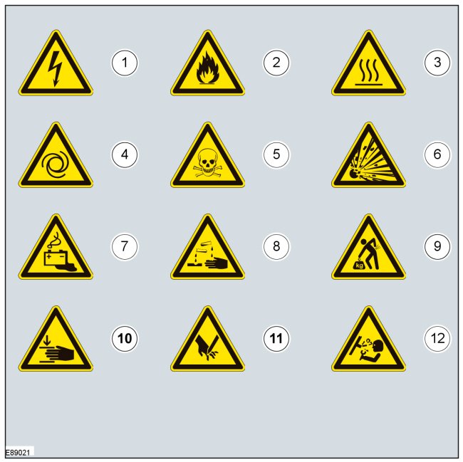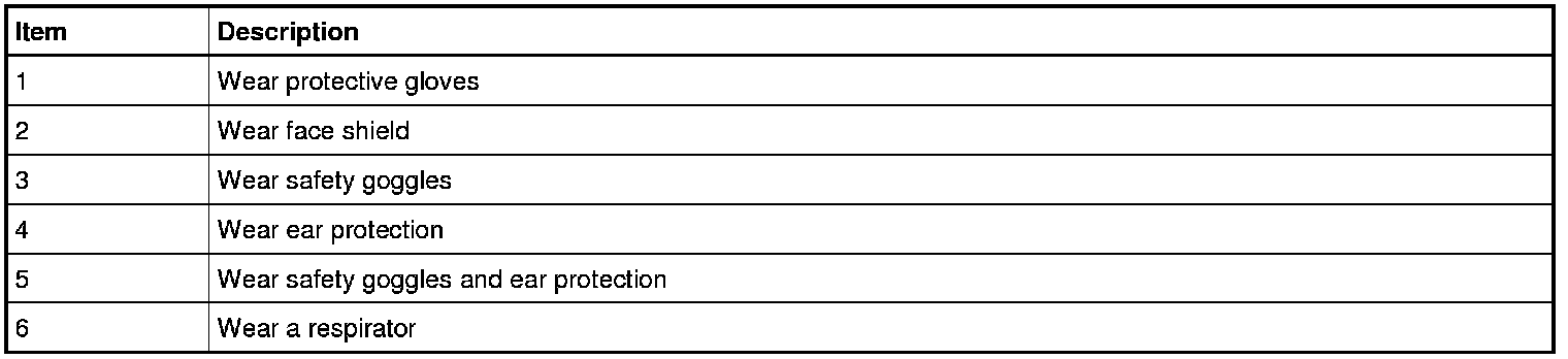 The protective equipment symbols indicate required safety equipment to avoid or reduce health and safety risks.