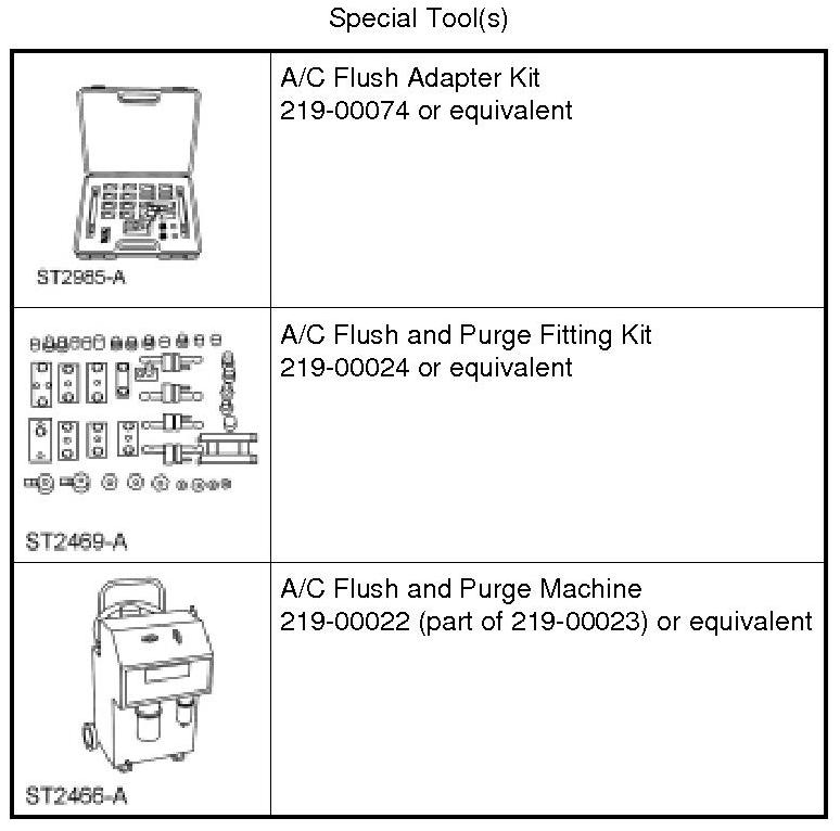 NOTE: Ford Motor Company has approved a procedure to provide technicians with a non-CFC method of flushing contaminated A/C system heat exchangers. The procedure allows the specific components to be cleaned and flushed while installed in their normal in-vehicle location. The types of contamination flushed include particle matter that results from A/C compressor or desiccant failure and gummy residue that can form when refrigerant oil is overheated during A/C compressor seizure. The flushing process is a 2-step procedure that involves the use of an A/C Flush and Purge Machine to: